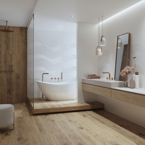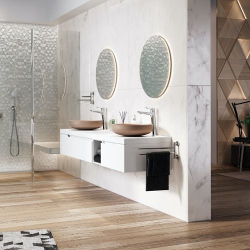 Wybór na rynku jest ogromny! Płytki mają swoje pięć minut, dlatego projektanci prześcigają się w wymyślaniu nowych wzorów, kształtów oraz deseni do modnej łazienki. Najnowsze trendy rekomendują proste formy, ale za to fantazyjnie położone – hitem są prostokątne (typu cegiełka), ale kładzione pionowo lub w jodełkę, jak parkiet.