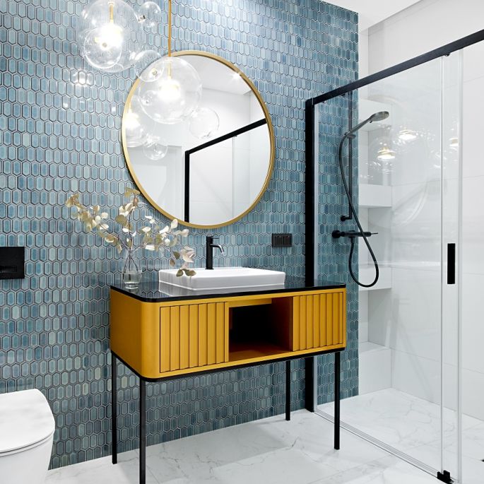 Więcej inspiracji i pomysłów na modne płytki łazienkowe zobaczysz w artykule: Jak ułożyć płytki w łazience – ponad 20 pomysłów na modne ściany w łazience.