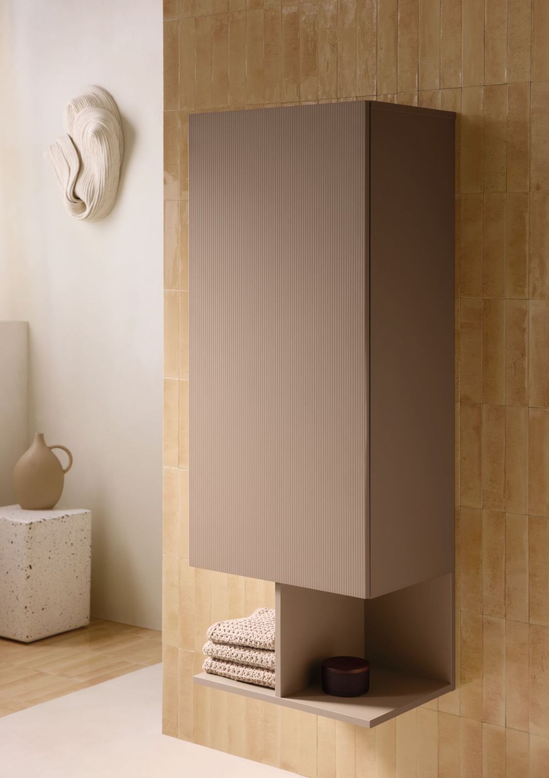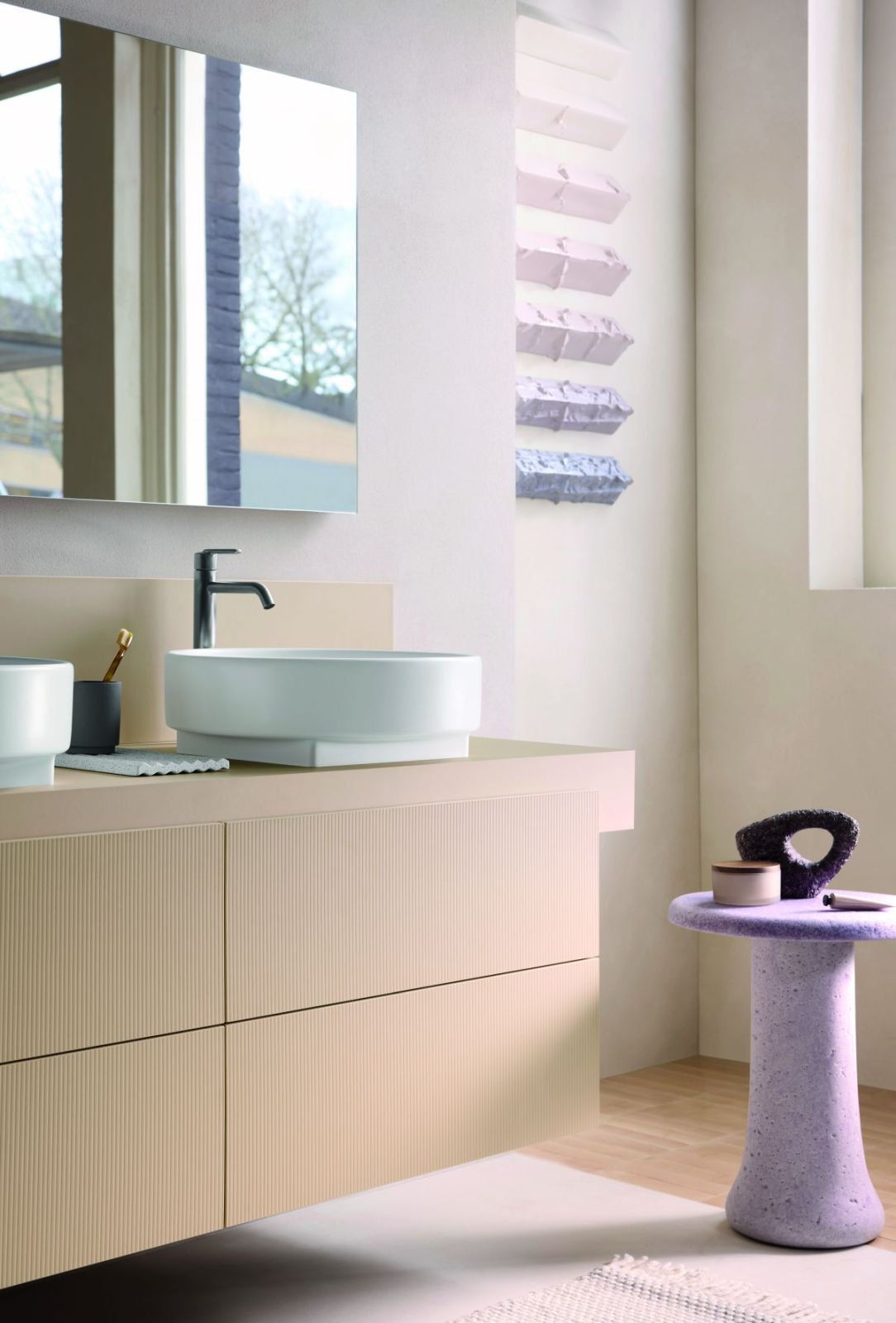Do designerskiej szafki dobierz koniecznie matową umywalkę w stonowanym, ale kontrastującym z meblem odcieniu. Do takiego zestawu z pewnością będzie pasowała prosta bateria umywalkowa w matowej czerni. Zauważ, że w aranżacji ze zdjęcia kanciastą formę szafki przełamano okrągłą formą umywalki, co dało bardzo ciekawy efekt. Całość rozświetla duża tafla lustra i szkliwiona płaskorzeźba na ścianie. Prosto, minimalistycznie, a efekt zaskakujący!