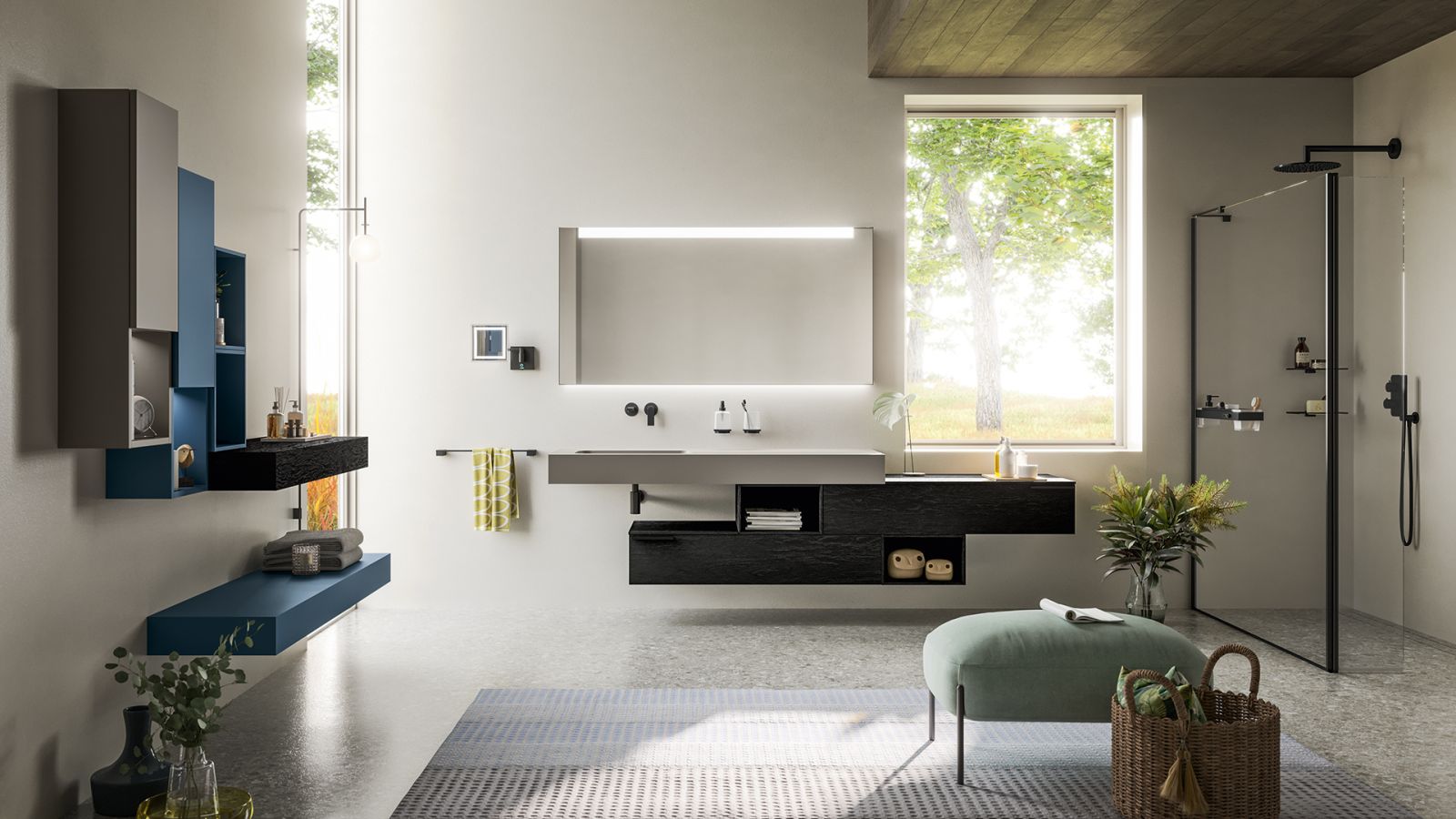 Strefy myjące chowają się we wnękach, za lekkimi ściankami. Łagodności dodają zaokrąglone kształty – prysznice zaczynają przypominać tuby, które otulają nas ze wszystkich stron. Wewnątrz nich pojawiają się siedziska – jak w tureckim hammamie – kamienne lub drewniane – do relaksu, peelingu, masaży.