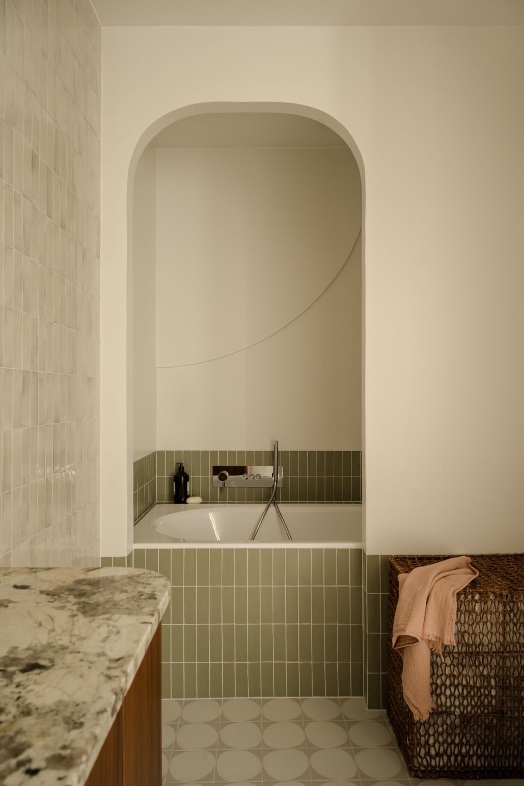 Miękkie, zaokrąglone formy – łuki we wnękach, organiczne kształty ceramiki i mebli łagodzą atmosferę