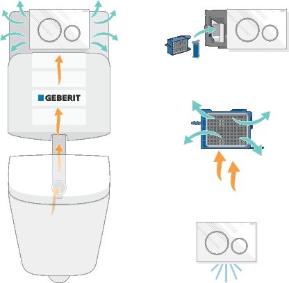 Odciąg powietrza włącza się automatycznie dzięki czujnikowi zbliżeniowemu. Dioda, dyskretnie umieszczona na dole przycisku, syganlizuje kiedy nastąpi konieczność wymiany filtra węglowego. Sama wymiana jest wyjątkowo prosta. Moduł Geberit DuoFresh można łatwo zainstalować w każdej spłuczce Geberit Sigma i połączyć z większością przycisków spłukujących z serii Geberit Sigma.