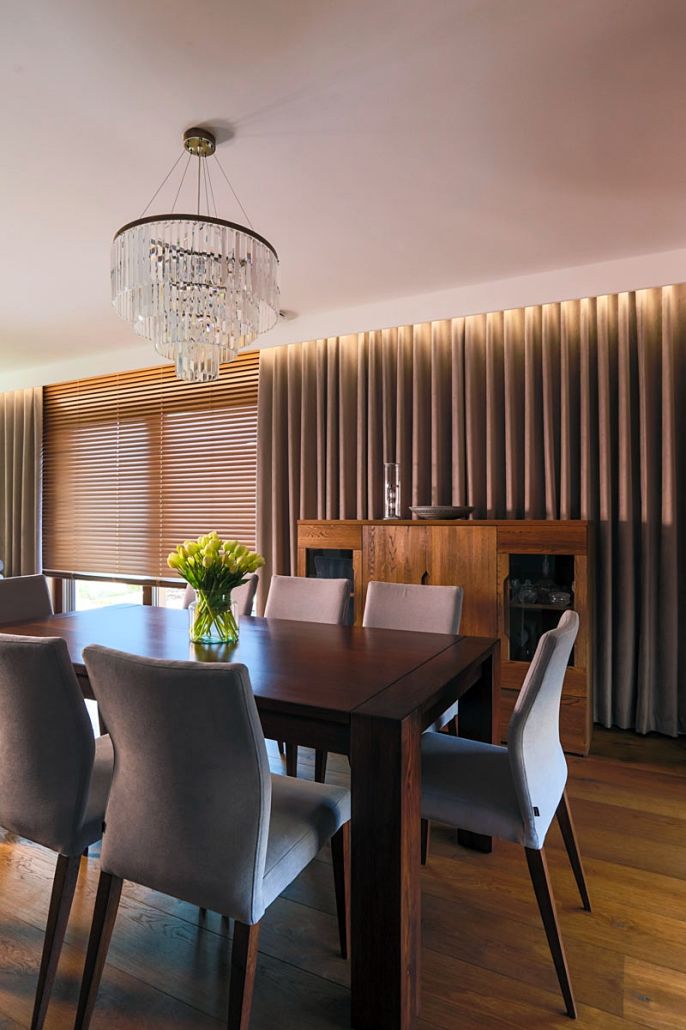 Połączenie żaluzji drewnianych i zasłon doskonale wygląda w dużych salonach i przestronnych pokojach dziennych z otwartymi kuchniami. W ciągu dnia żaluzje chronią wnętrza przed nadmiernym nasłonecznieniem, a wieczorem, kiedy zależy nam na prywatności i stworzeniu nastrojowego klimatu, możemy zaciągnąć zasłony i schować się przed wzrokiem sąsiadów.
