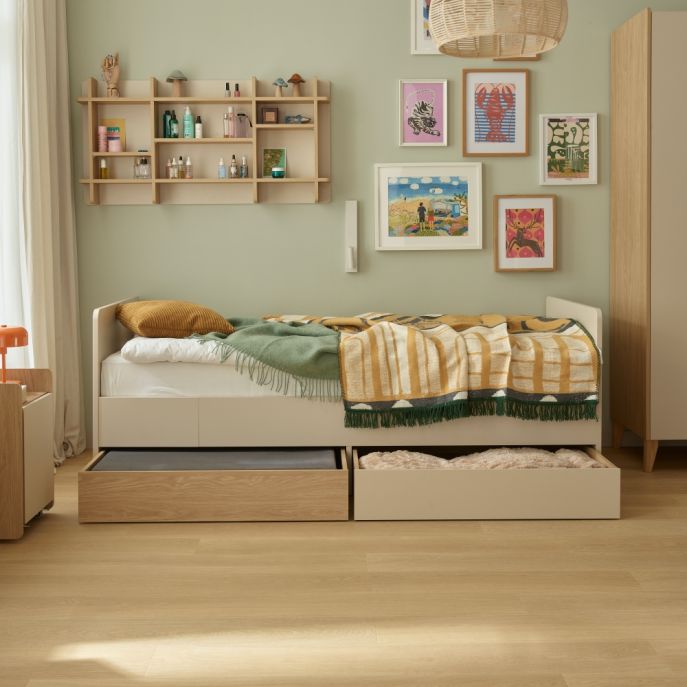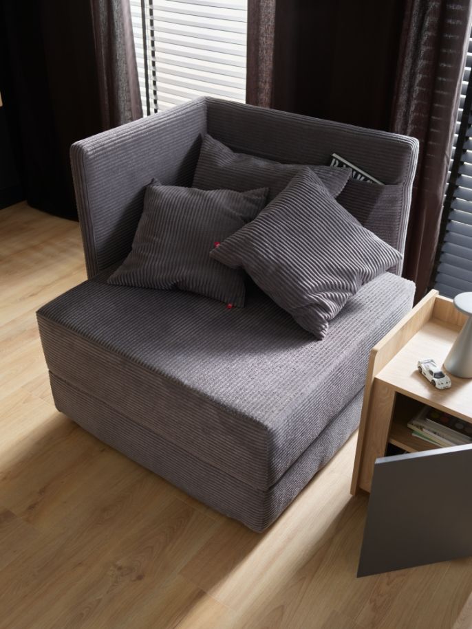 Wybrane bryły mają także funkcje „rośnie razem z tobą” – takie, jak regulacja wysokości biurka czy długości łóżka, co w połączeniu z wysoką jakością materiałów, trwałością i staranności wykonania pozwala na użytkowanie mebli przez lata. Oprócz mebli skrzyniowych w kolekcji znajdziemy także fotel tapicerowany, rozkładany, leżankę. To praktyczne rozwiązanie, które łączy funkcję wygodnego siedziska i materaca do spania.