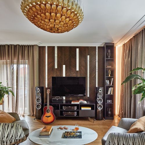 W salonie modern classic dobrze wyglądają również tapety o delikatnych, geometrycznych wzorach lub subtelnych fakturach, np. imitujących marmur czy jedwab.