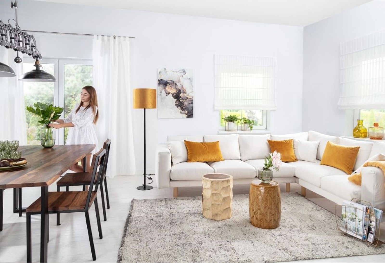 Jakich zasad aranżacji przestrzegać? Duży dywan w salonie powinien znajdować się w takiej odległości od ścian, abyśmy mogli swobodnie ustawiać wzdłuż niego meble. Dywan pod kanapą lub pod narożnikiem powinien wystawać co najmniej 10 cm, aby był widoczny. Natomiast w kąciku jadalnianym powinien wychodzić poza linię krzeseł, inaczej będzie utrudniał wstawanie od stołu. Do jadalni najlepiej wybarć gładki dywan, który łatwiej utrzymać w czystości. I jeszcze jedna rada – jeśli leży bezpośrednio na drewnianej, lakierowanej podłodze, możemy go dodatkowo zabezpieczyć przed przesuwaniem.
