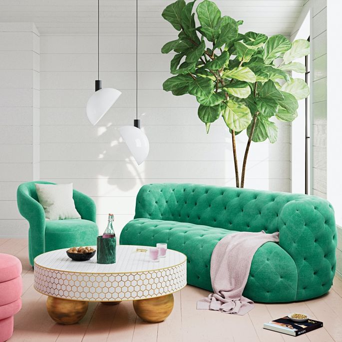 Jeśli masz wystarczająco dużo miejsca na ustawienie kanapy na środku pomieszczenia, zrób to. Będzie przyciągała wzrok. Dopasuj ją do innych mebli w pokoju dziennym i stylu wnętrza, by stworzyć spójną aranżację. Jeśli chcesz, żeby była mocnym punktem w salonie warto rozważyć efektowną tapicerkę – gładką w wyrazistym kolorze lub w spokojniejszym odcieniu za to w ładny deseń.