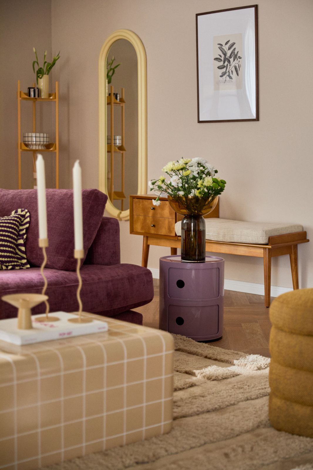 Kolory, wyraziste, ale nie krzykliwe, podkreślają miękkie linie mebli, pozwalają się wyciszyć. Tu każdy mebel ma inny kolor, a jednak do siebie pasują. Sofa w ceglanej czerwieni pięknie komponuje się z fuksją pufa i delikatnym różem fotela. Taki kolorystyczny melanż sprawia, że wnętrze żyje, a cała aranżacja prezentuje się ciekawiej.