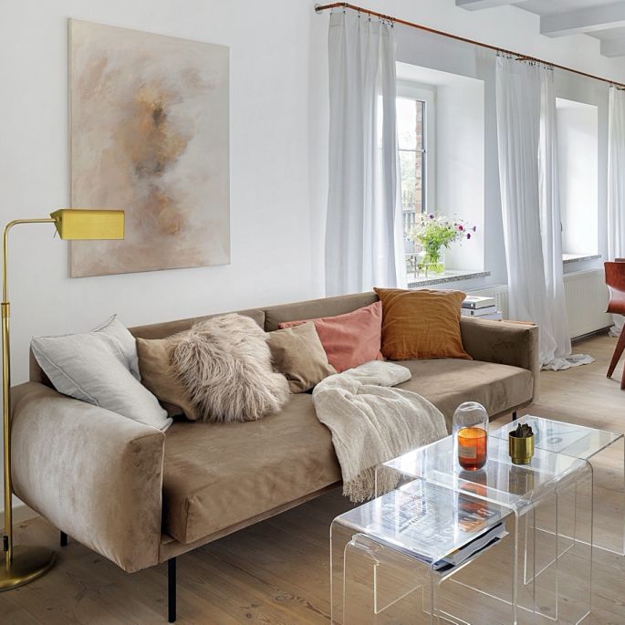 Ile by się czasem dało za piękny widok? A w dodatku za widok z kanapy? Postawienie sofy na tle okna najlepiej sprawdza się w dwóch przypadkach: jeśli mamy za oknem piękny krajobraz (zieleń, pejzaż górski czy jezioro) lub ponadprzeciętną architekturę (np. zjawiskową secesyjną kamienicę).