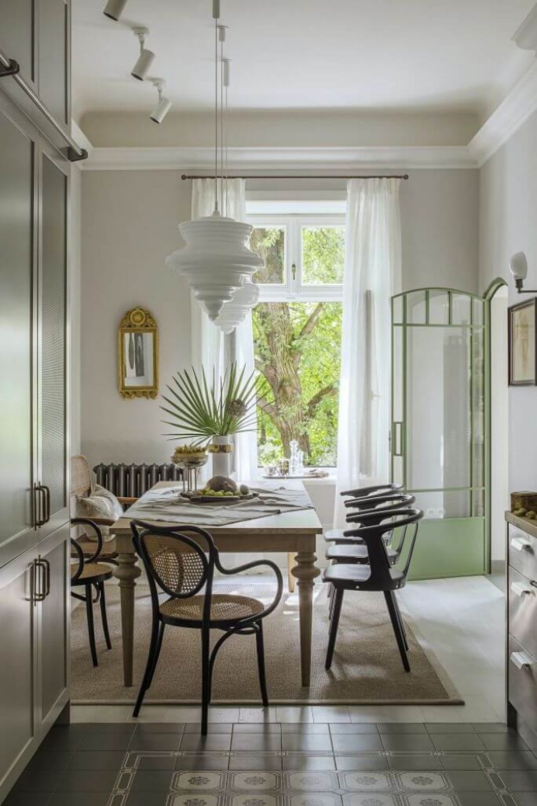 Z prostym stołem i klasycznymi krzesłami np. typu thonety pięknie zagra dywan w historyczne wzory. Będzie on elementem wydzielającym tę część od reszty pokoju. Wtedy tzw. wypoczynek musisz zaaranżuj z boku, najlepiej na tle dużych okien albo w pobliżu kominka.