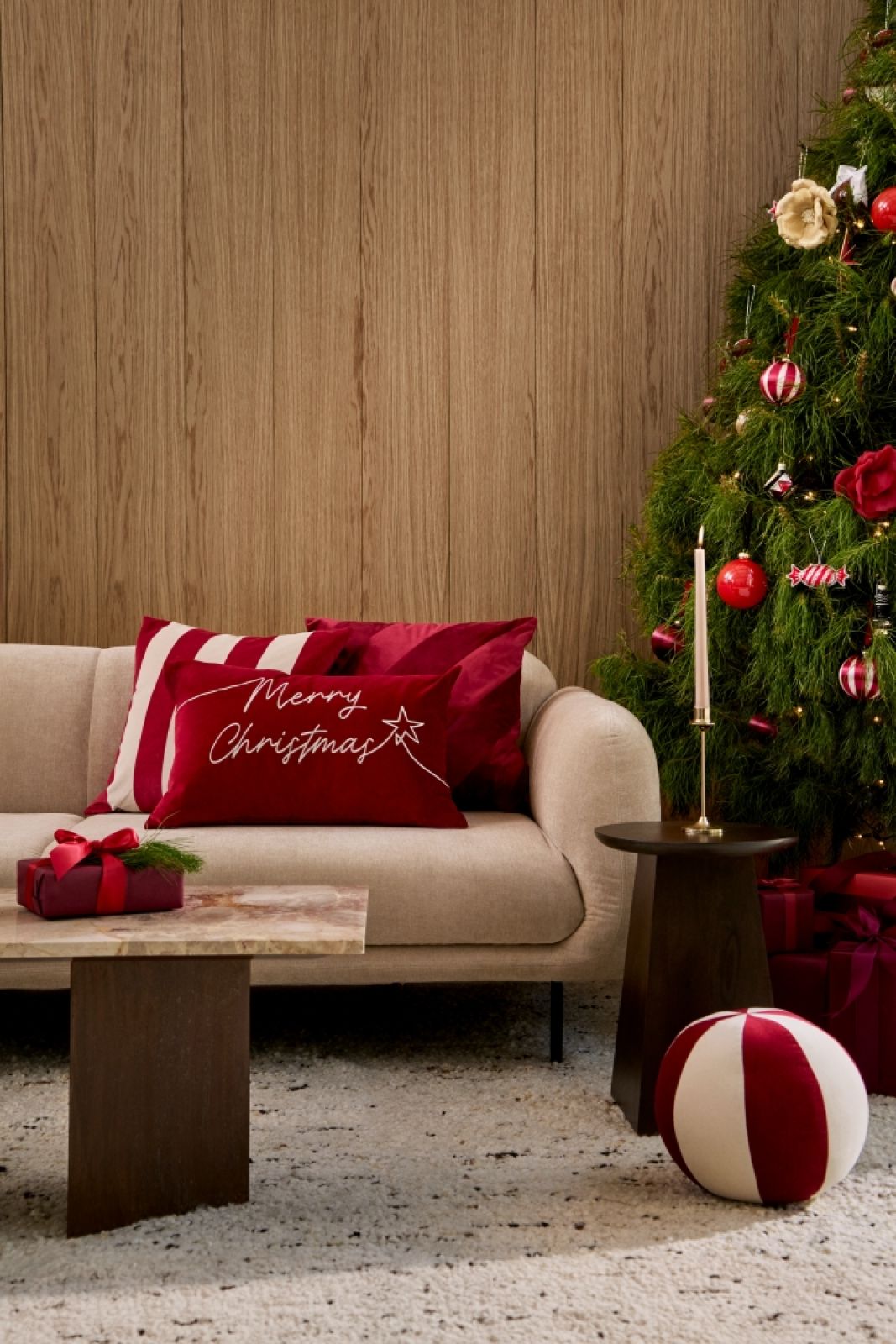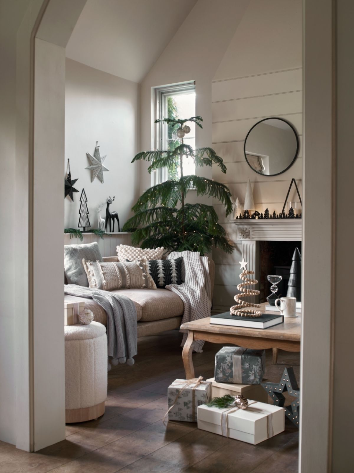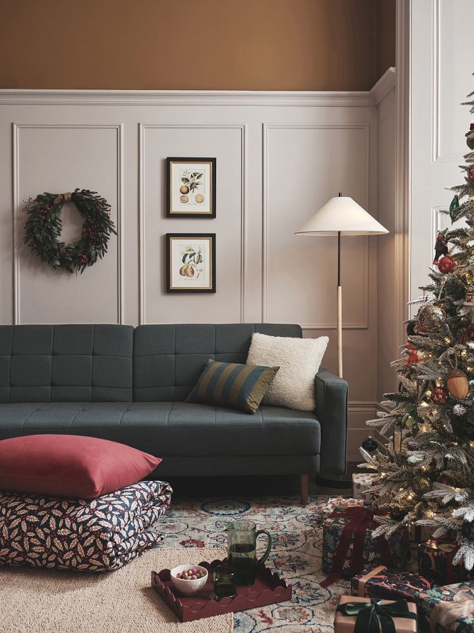 Twórz świąteczne zakątki w różnych częściach salonu, a aranżacja będzie ciekawsza. Wykorzystaj do tego niewielkie meble, np. stolik, puf czy konsolę.