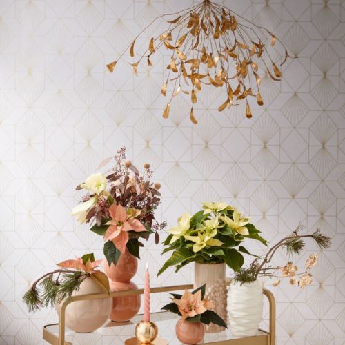 Ozdób ściany wokół stołu wigilijnego dekoracjami, które podkreślą świąteczny wystrój salonu. Girlandy, rozety, gwiazdy betlejemskie, wyczarują klimat. Rozrzuć wokół podarki dla bliskich – pięknie zapakowane prezenty także będą ozdobą salonu w wigilijny wieczór.
