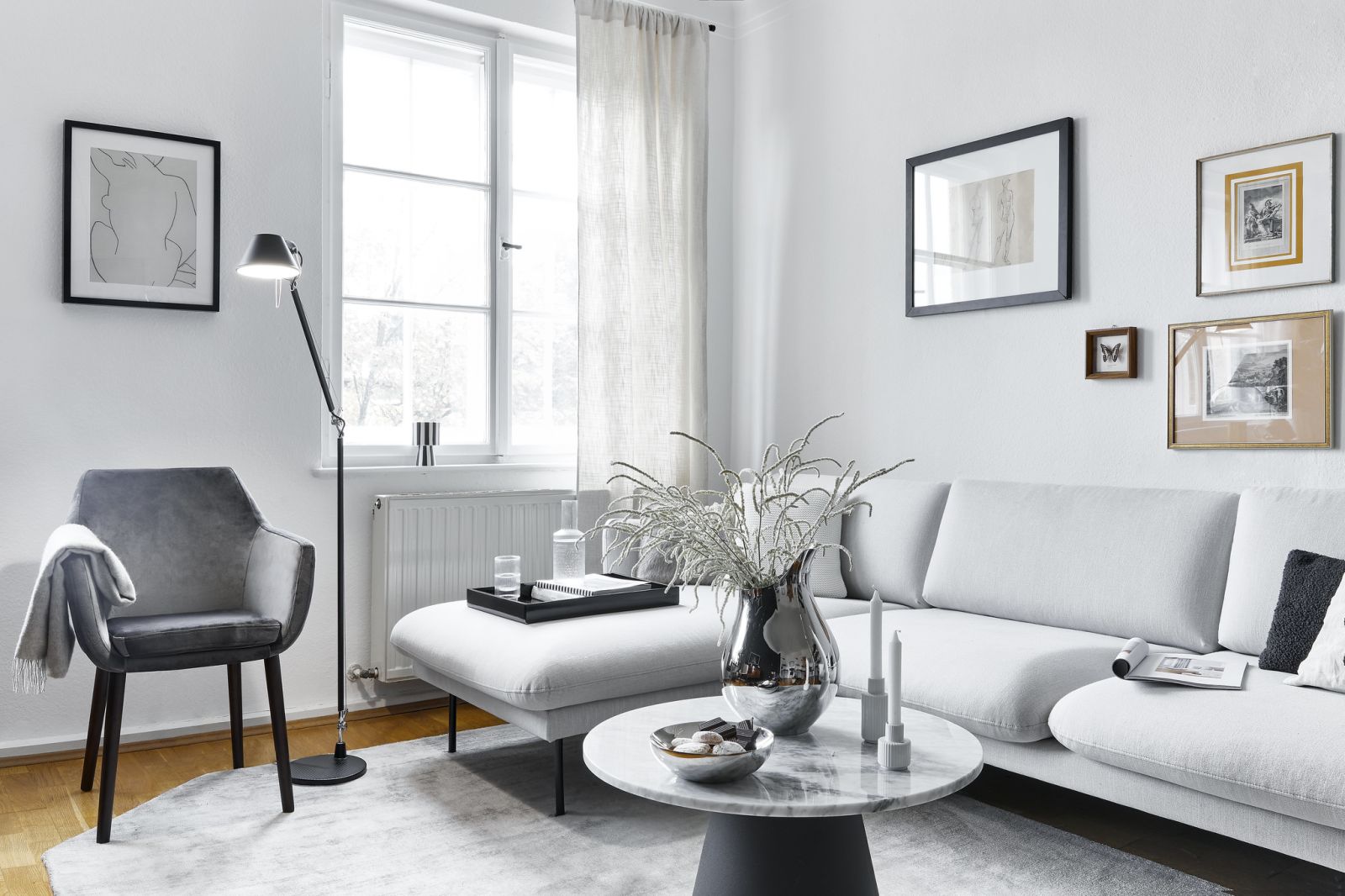 Jeśli nie chcesz wprowadzać zbyt dużo kolorów i wolisz pozostać przy stonowanym, neutralnym wnętrzu zastosuj biel – białe meble i dodatki, stolarka, sufit rozjaśnią szary salon i nadadzą mu lekkości. Wspaniale sprawdzają się też rośliny – duże okazy stawiaj w donicach, a z mniejszych twórz zielone botaniczne zakątki w swoim salonie.