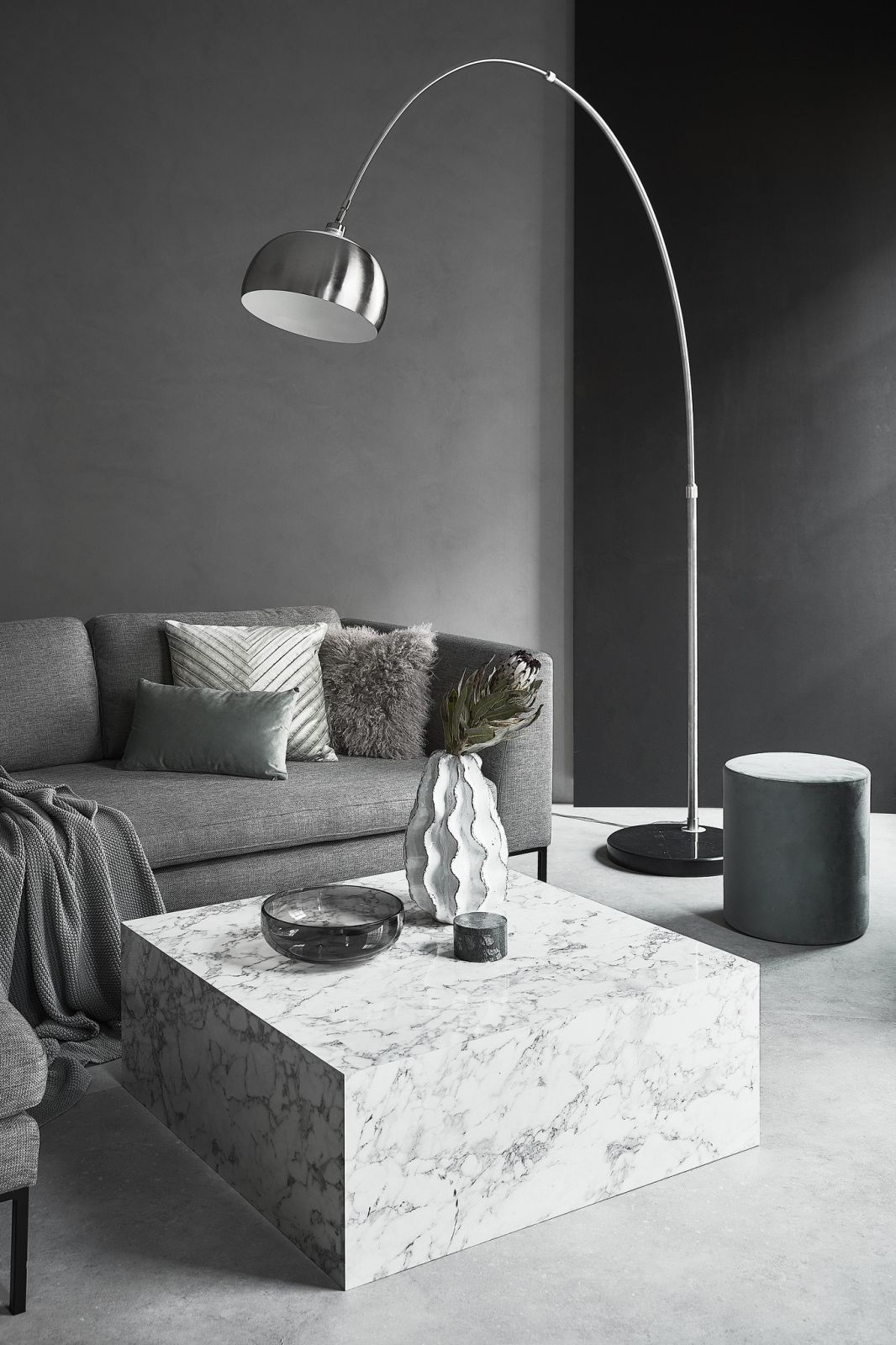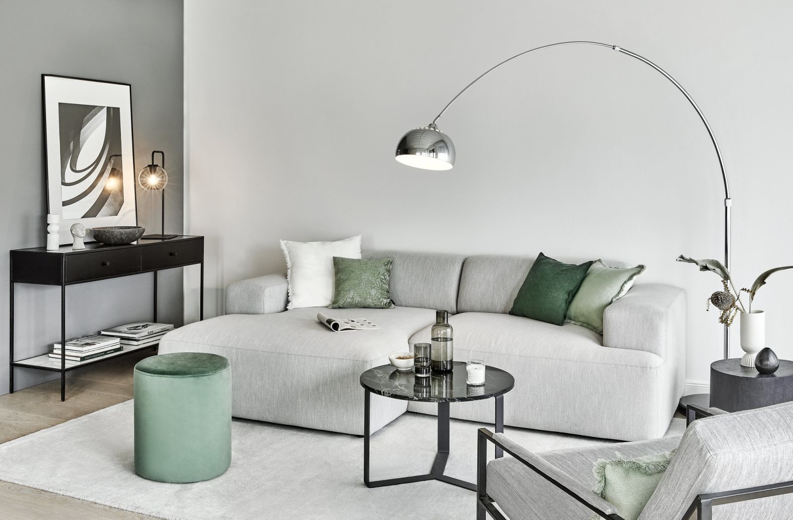 Wyeksponuj światłem tę strefę, w której najczęściej przebywasz, czyli kącik do relaksu. W pobliżu sofy postaw lampę podłogową lub zamontuj na kinkiet ścienny na długim ramieniu. Ciepłą atmosferę stworzą lampki typu grzybki – potraktuj je także jako dekoracyjne dodatki i wybierz w kolorach, które ożywią nowoczesny szary salon. Możesz je stawiać na mniejszych stolikach, na półce czy okiennym parapecie.