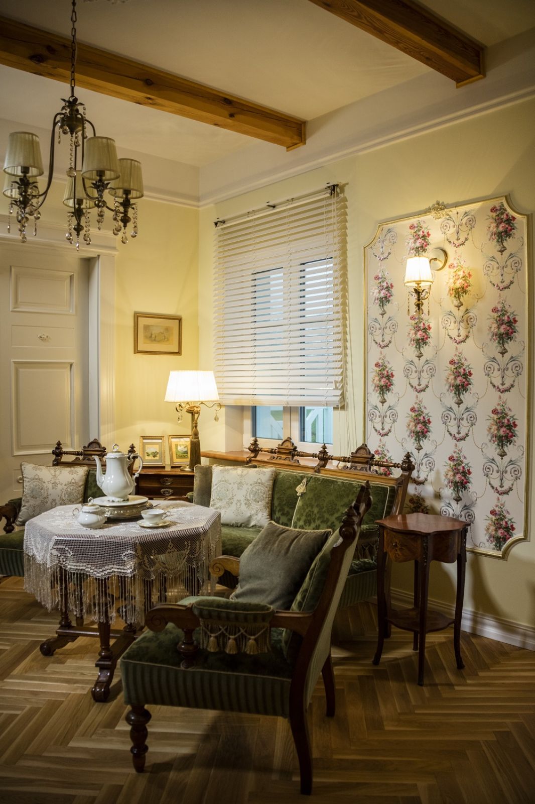 Zaprezentowane wnętrze ze względu na bogate wyposażenie i mnogość odpowiednio dobranych elementów dekoracyjnych, przenosi nas w podróż pod koniec XIX wieku. Pomimo, iż żaluzje zyskały na popularności dopiero sto lat później, ich wykorzystanie podczas aranżowania salonu w stylu dworkowym utworzyło niesamowitą kompozycję. W tym przypadku biały kolor żaluzji poziomych Retro od firmy ANWIS nadaje całemu pomieszczeniu harmonii i dobrego smaku. Nie kontrastuje z wystrojem domu, lecz pozwala na skrzętne wkomponowanie dodatkowego elementu ozdobnego, stanowiącego jednocześnie praktyczną i elegancką osłonę okien. W połączeniu z wysoką jakością i wytrzymałością zastosowanego gatunku drzewa (abachi), otrzymujemy produkt godny prawdziwego szlachcica.