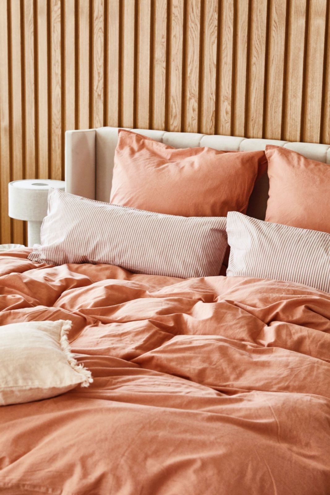 A co powiesz efektowne wykończenie ściany za łóżkiem lamelami? Zobacz, jak prezentują się na zdjęciu dekoracja z jasnego drewna i miękkie panele obszyte ozdobną tkaniną. Prosty sposób, a efekt wielki!