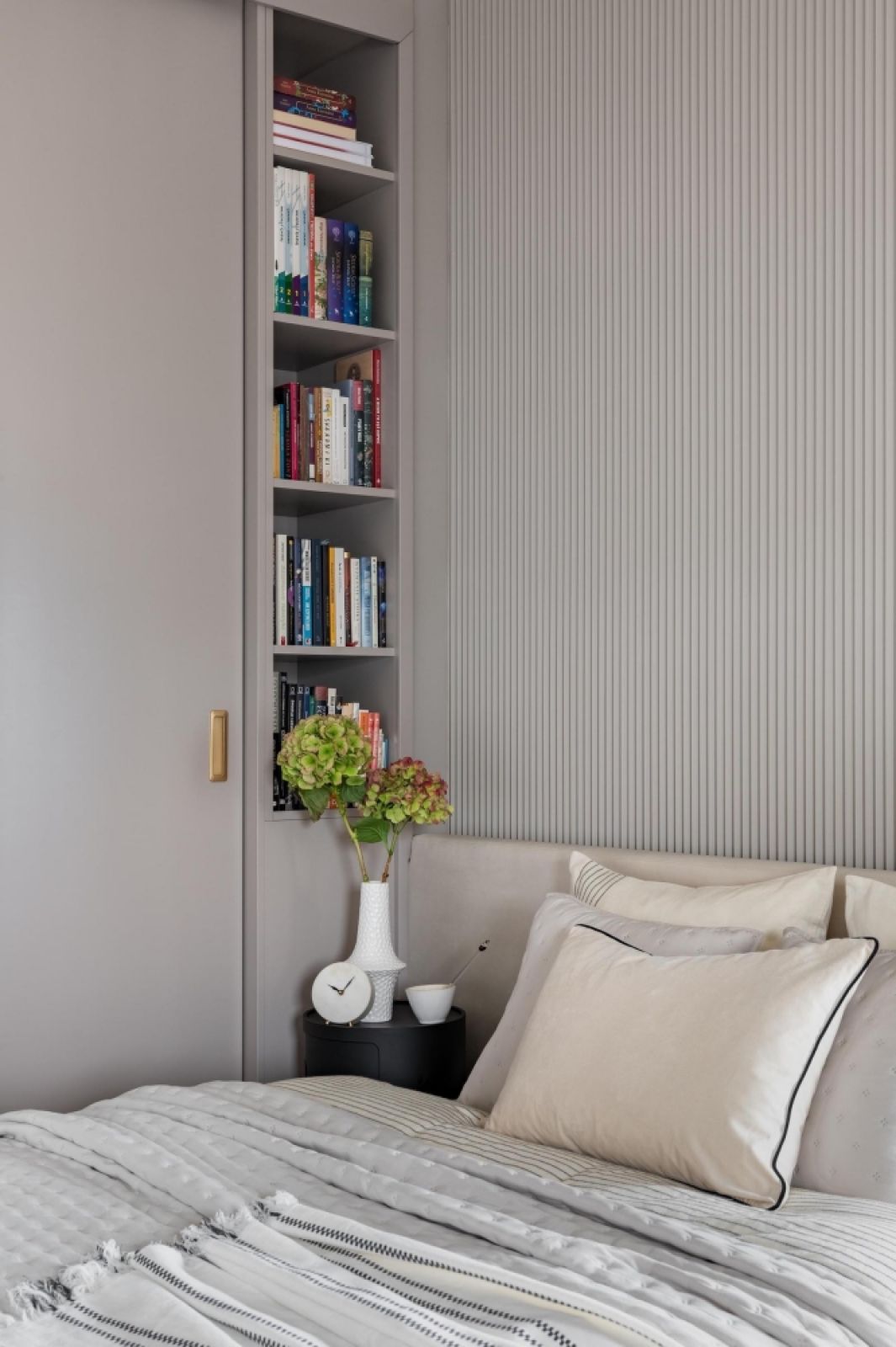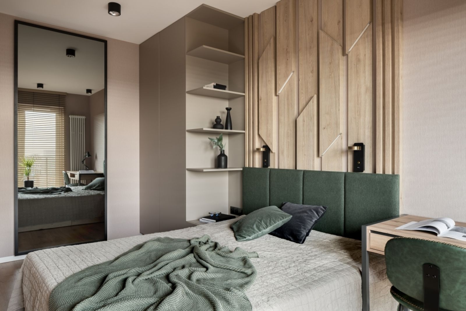 Ryflowania kontra gładź, czyli pomysłowa kompozycja z lameli i szafek w sypialni