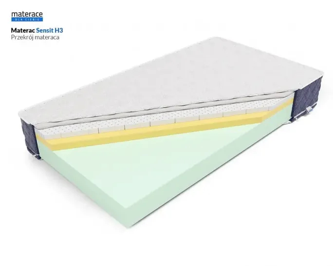Jego bazę stanowi elastyczna i wytrzymała pianka HR FreshElastic, która zapewnia solidne podparcie całego ciała. Warstwa termoelastycznej pianki PerfectSuite (VISCO/memory) o grubości 5 cm idealnie dopasowuje się do sylwetki, reagując na ciepło i nacisk, a 4 cm pianki FlexyLateks gwarantuje przyjemną miękkość i sprężystość w górnej części materaca. Sensit H3 to model o podwyższonej twardości, rekomendowany dla osób powyżej 80 kg.