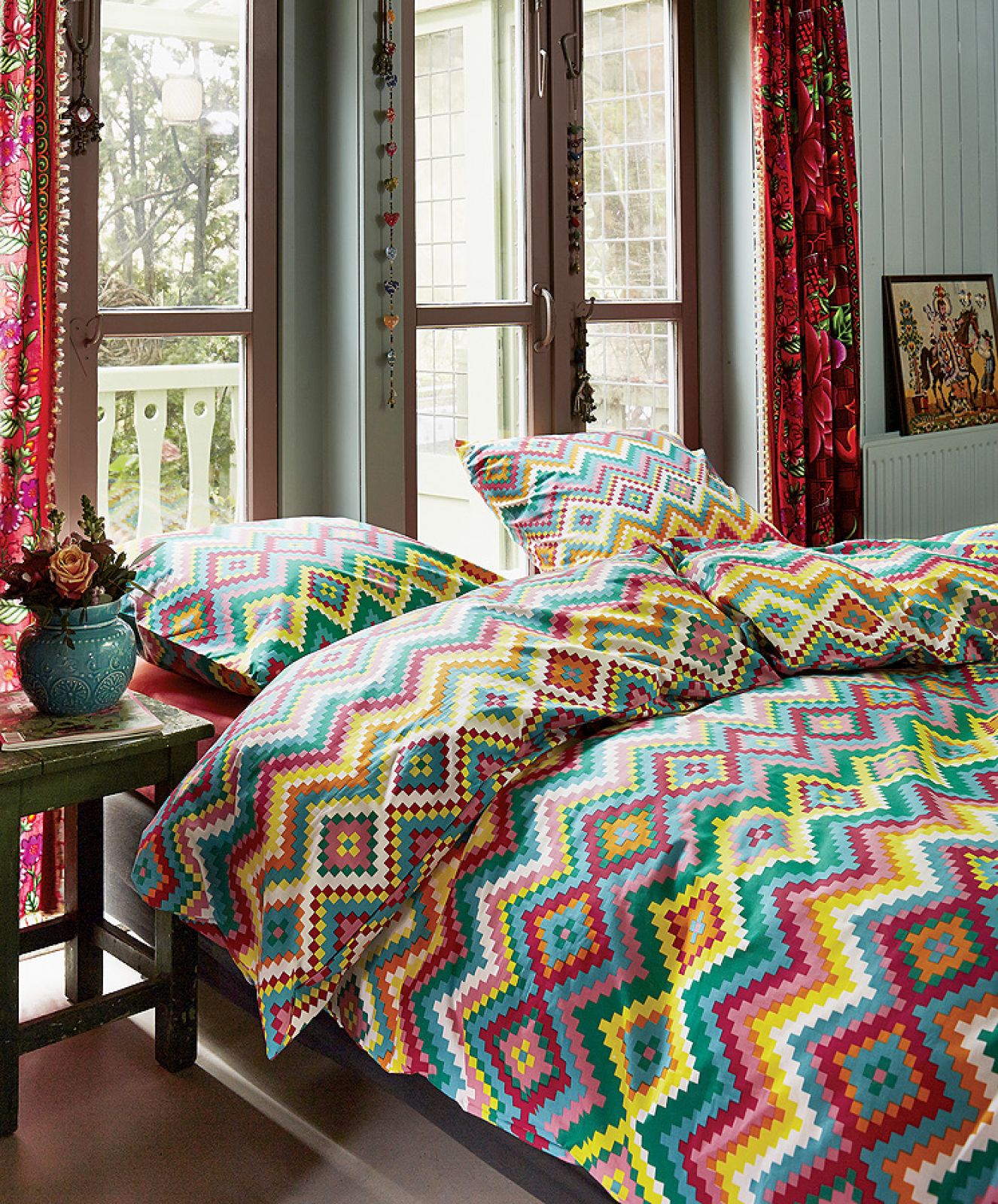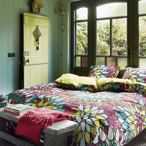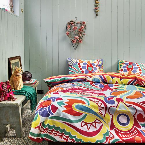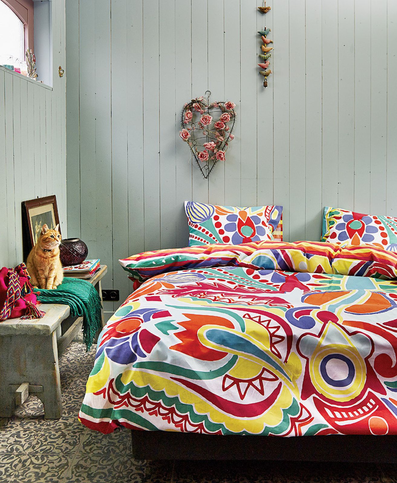Melli Mello: Nazwa wzięła się od francuskiego méli-mélo, co znaczy miszmasz. Bo holenderska marka łączy elementy z różnych kultur i stylów. Jest trochę grafiki, trochę kwiatów, trochę etnicznych motywów. Dużo złota i metalicznego połysku. Tu łypie na nas sowa, tam z tropikalnej roślinności wychyla się papuga. Pozornie nic do siebie nie pasuje, a jednak wszystko gra. Mocnymi kolorami, odważnymi zestawieniami. Słowem, boho w pościeli.