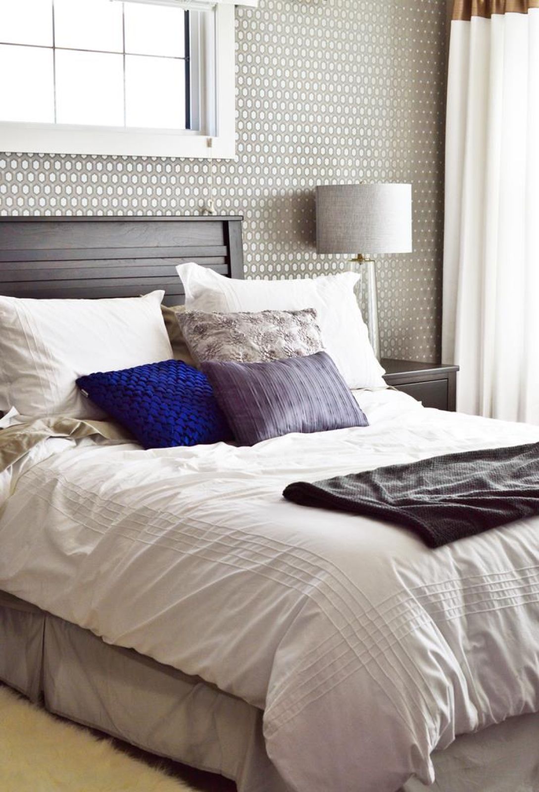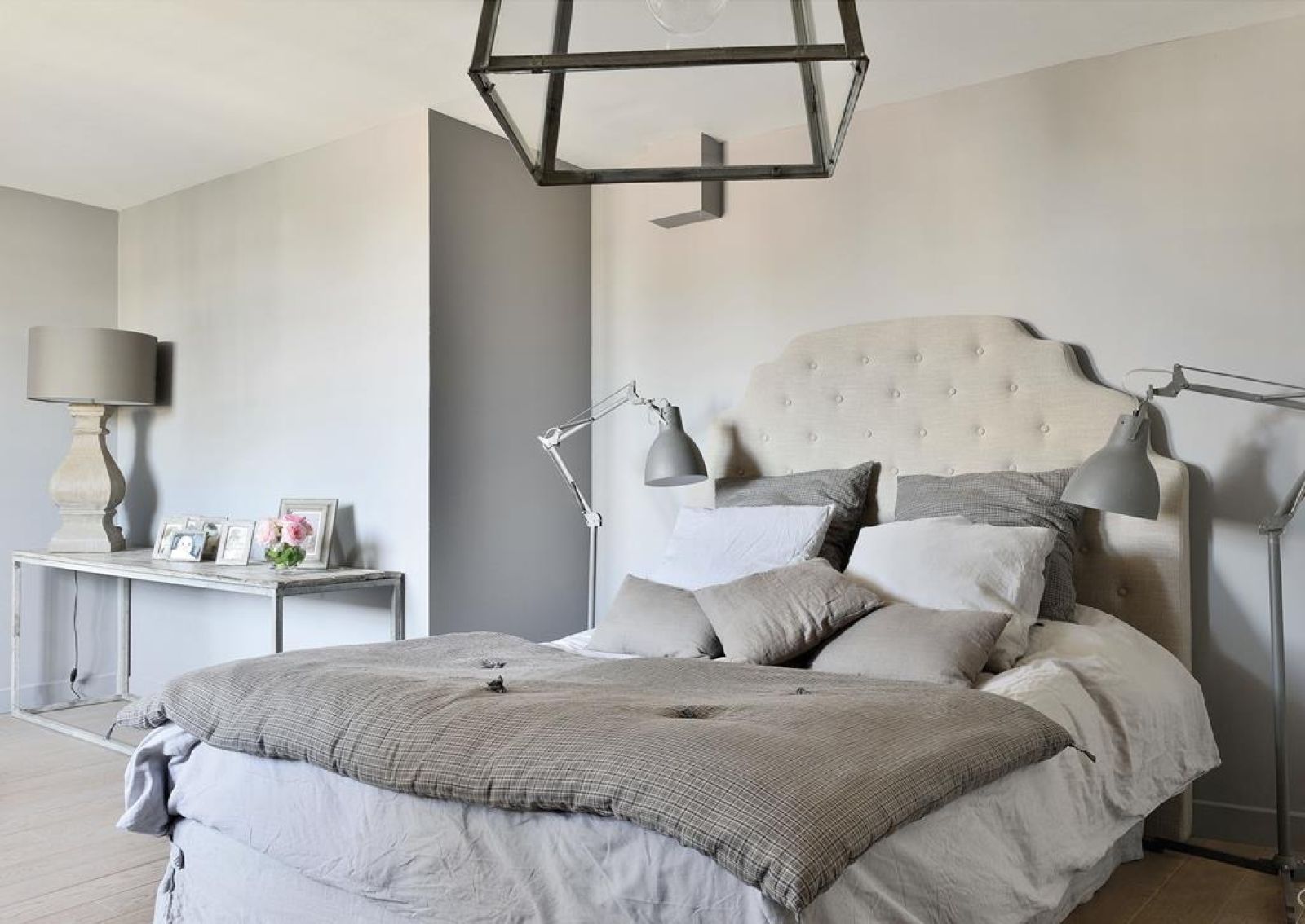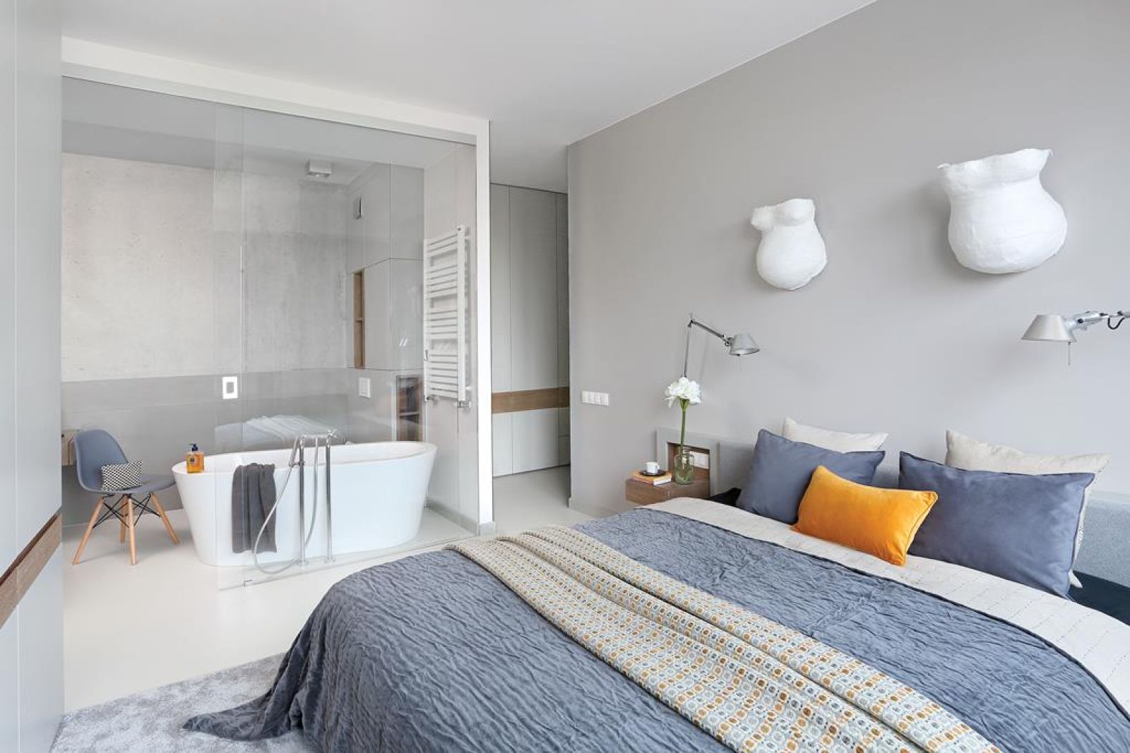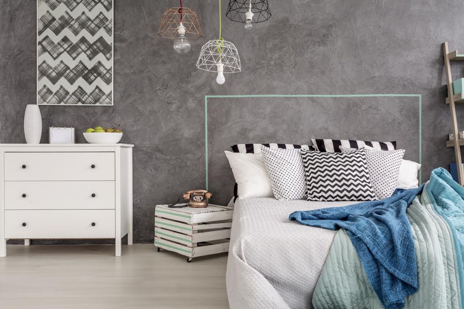 Przy szarej sypialni warto zdecydować się na białe meble. Kontrastowe wyposażenie w stosunku do koloru ścian zaprowadzi ład i przejrzystość w sypialni. Pamiętajmy także, że główna uroda łóżka leży w pościeli i rodzaju zagłówka, nie w samej ramie.
