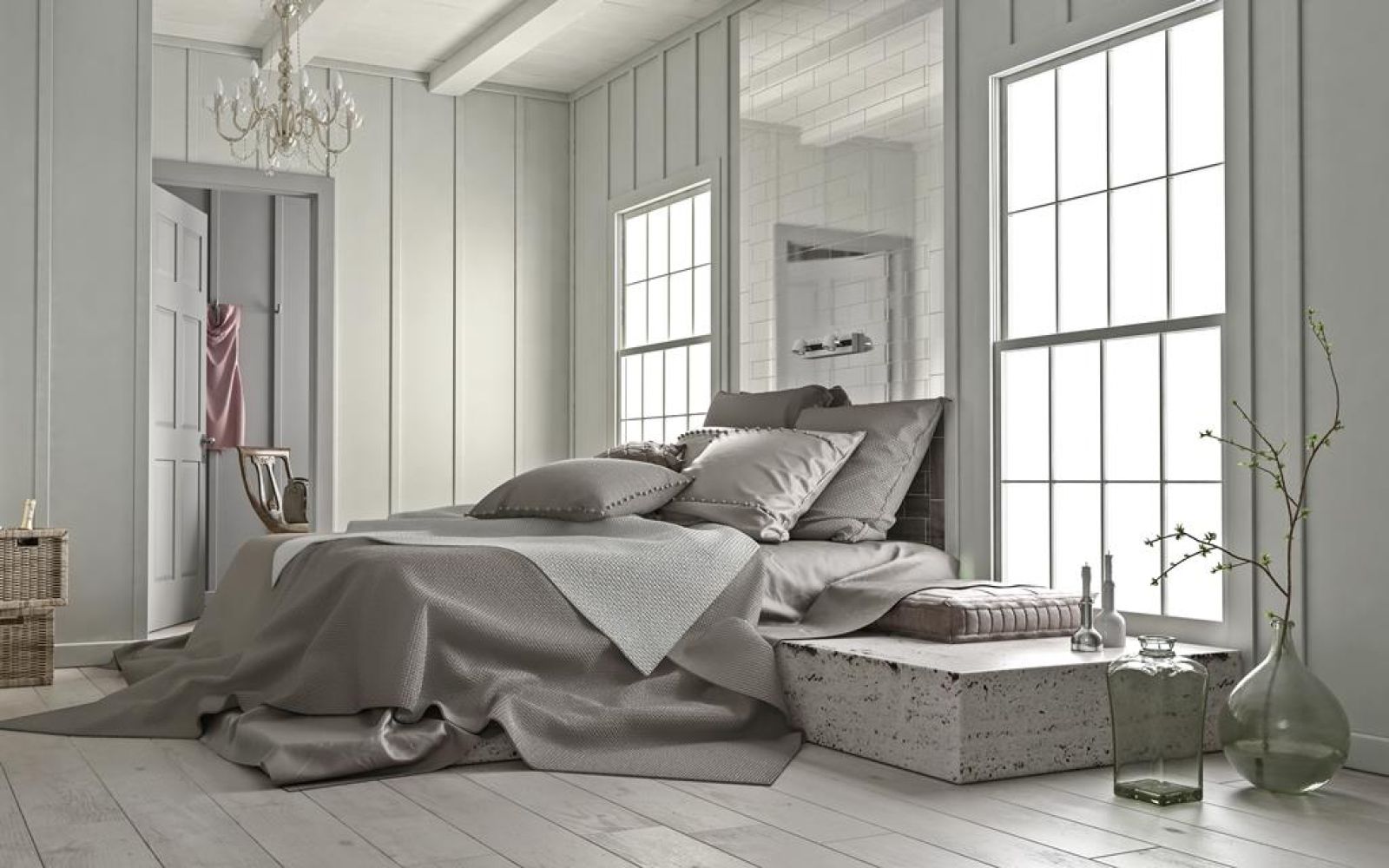 Białe meble są uniwersalne i pomagają uwypuklić pozostałe wyposażenie wnętrz. Przywiązujmy uwagę do dodatków: poduszek, obrazków, lamp nocnych czy kwiatów doniczkowych na parapecie. Szare sypialnie są charakterystyczne dla stylu skandynawskiego, w którym stawia się na białe lub naturalnie drewniane meble o ascetycznej linii i optymistyczne wstawki.