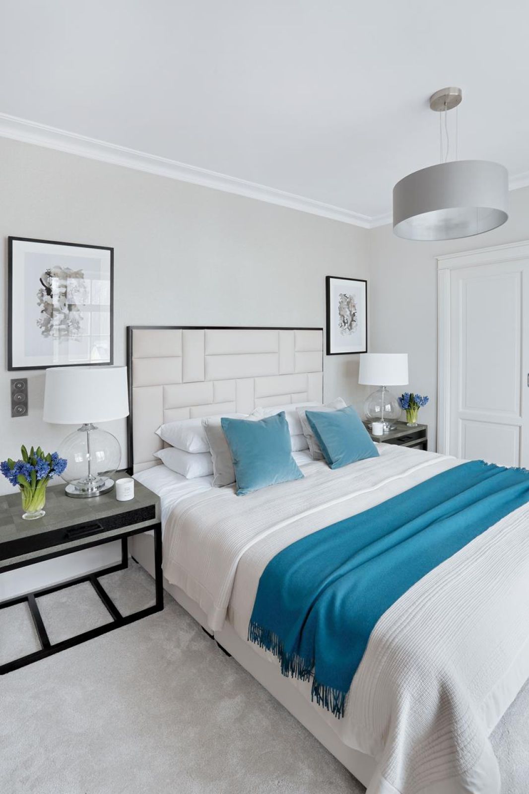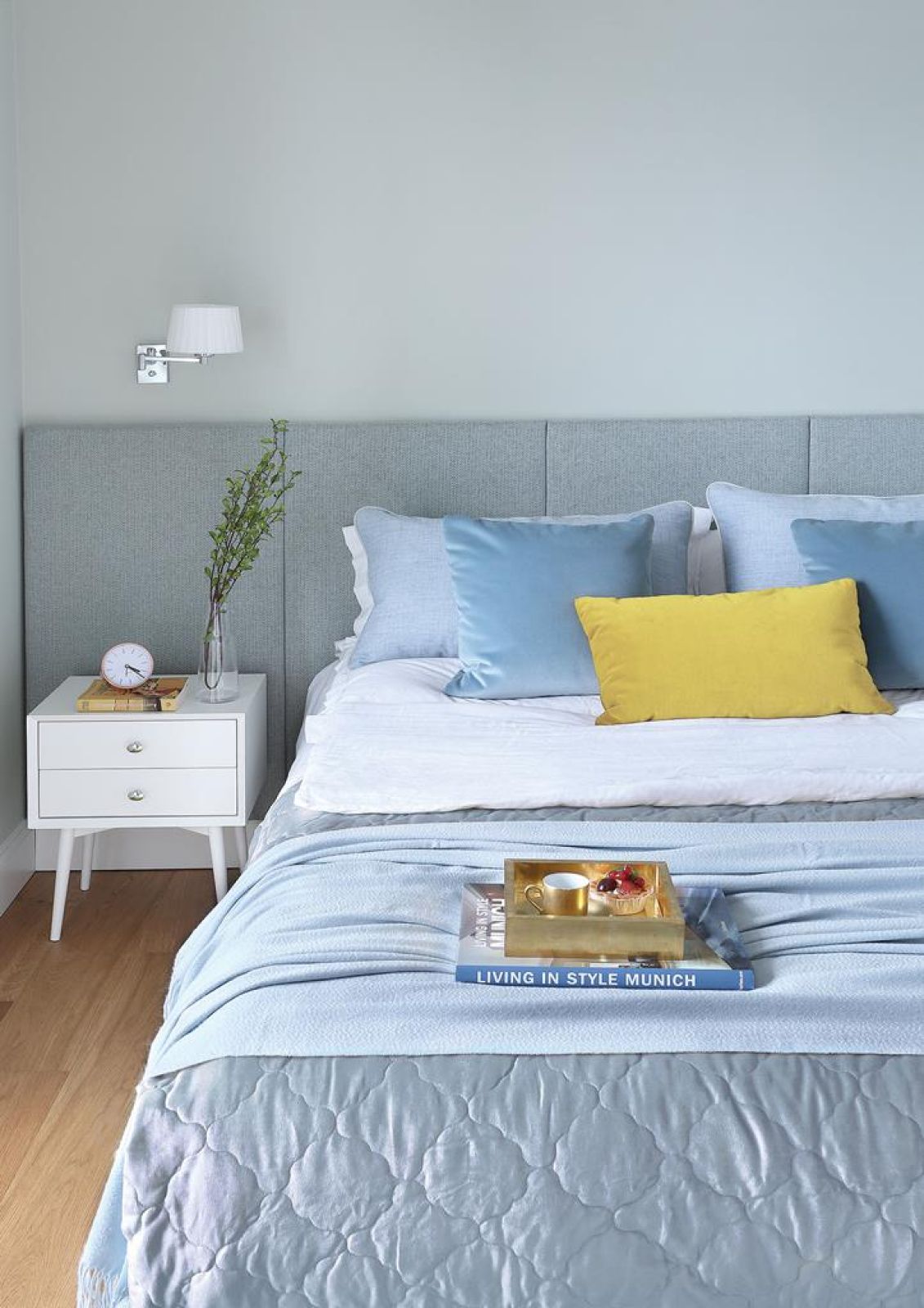 Inny popularny trend to sypialnia szaro-turskusowa lub szaro-miętowa. Zielonkawy kolor wnosi powiew świeżości do domu i szczególnie dobrze łączy się z szarościami. Taką aranżację można uzupełnić o niewielkie ilości bieli lub beżu.
