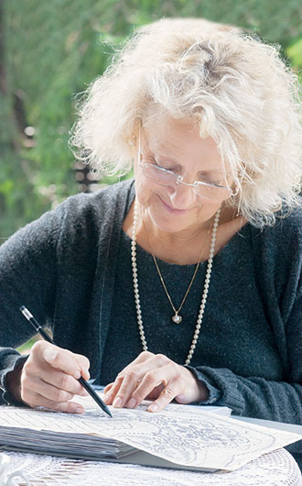 Gdy siatki są gotowe, czas na wzory. Wszystko musi być rozpisane kratka po kratce. Pani Teresa rozwija koronkę. – Tak to trzeba wyliczyć, żeby z kwadracików wyszła okrągła serweta, która się nie ciągnie. Na siatce haftuje się nicią, wystarczą trzy ściegi: płócienny, koszykowy i dziergany.