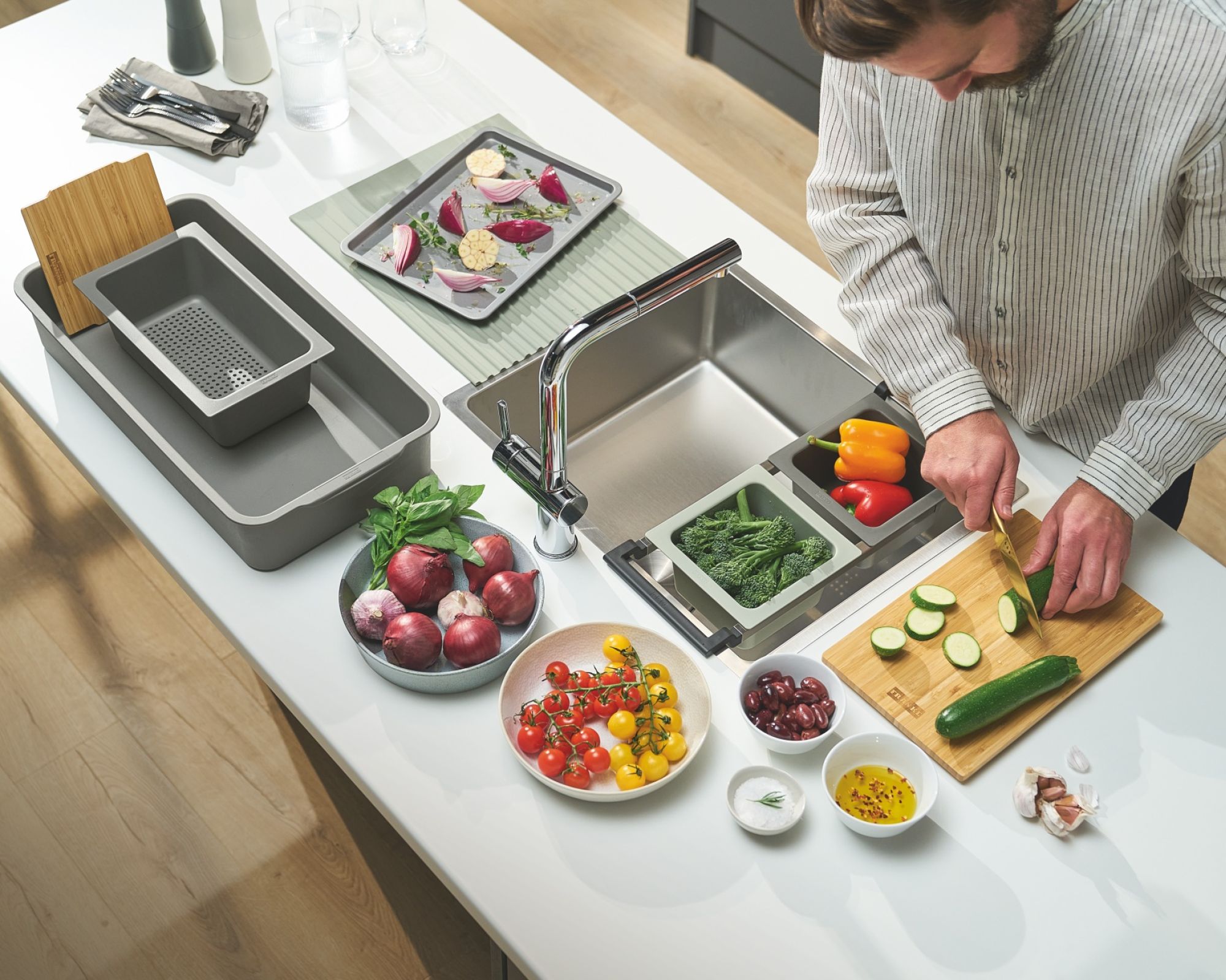 Z organizerem do zlewu ALL-IN pokroisz składniki, osuszysz warzywa i owoce, łatwiej posprzątasz kuchnię, a nawet przechowasz jedzenie w lodówce. To wszystko dzięki modułowym akcesoriom do zlewozmywaka, z których można korzystać na wiele sposobów. Innowacyjność ALL-IN zapewniła mu prestiżową nagrodę Red Dot 2022.