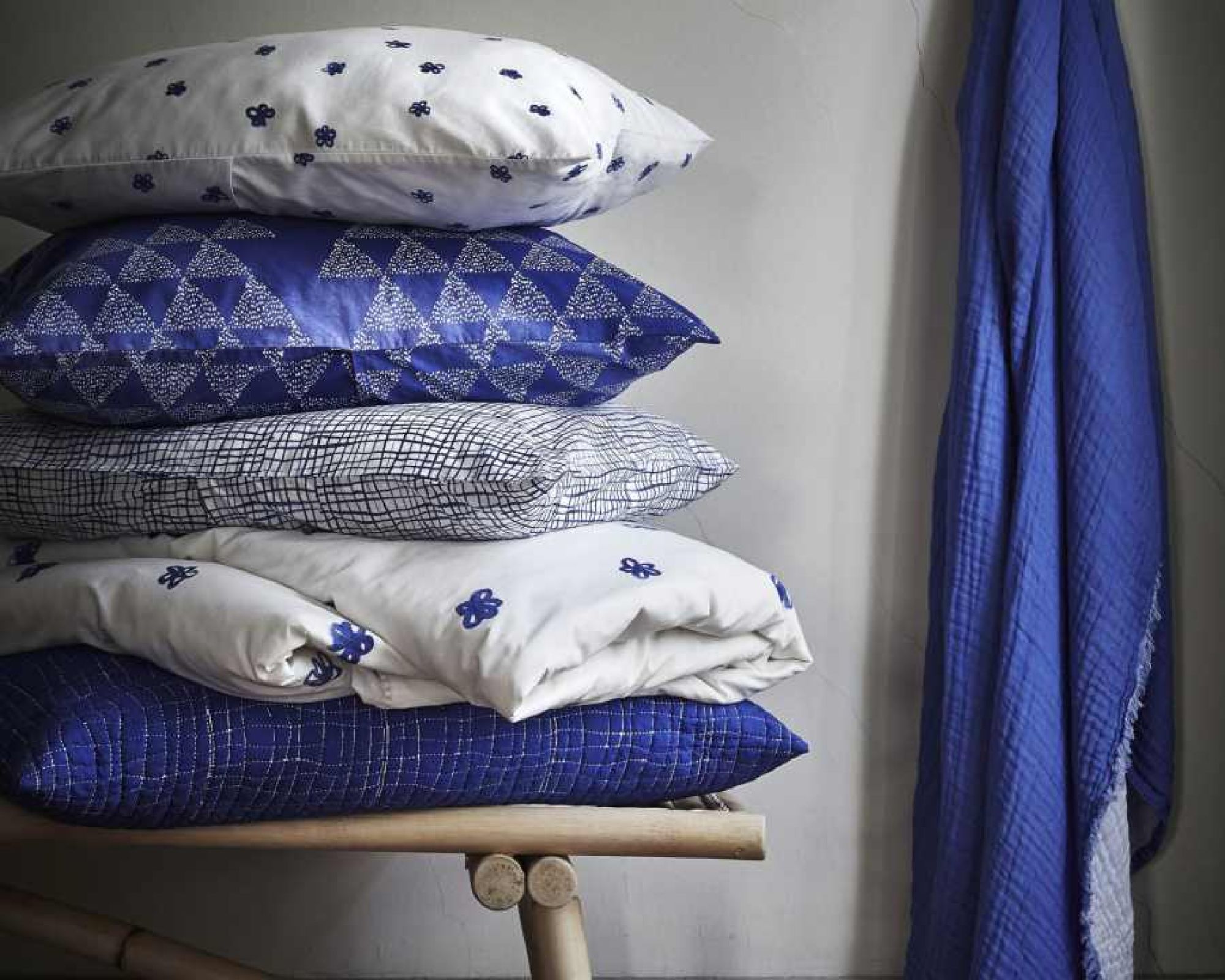 Rattanowe meble i tkaniny w kolorze indygo dla szukających spokoju.