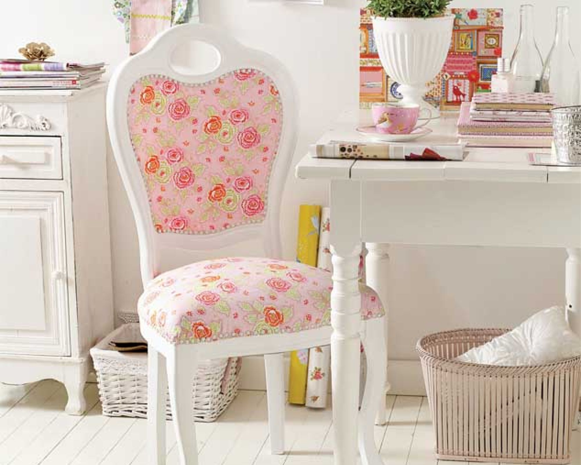 1. Usuwamy gwoździe i starą tapicerkę. Jeśli tkanina jest w dobrym stanie, zostawiamy ją jako podkład (gdyby była za ciemna i przebijała przez nową, jaśniejszą, wkładamy między nie dodatkową warstwę materiału). 2. Przed pomalowaniem musimy zeszlifować lub zmatowić i oczyścić powierzchnię krzesła, aby farba lepiej się trzymała. Jeśli nie mamy szlifierki, wystarczy klocek z drobnoziarnistym papierem ściernym. 3. Małym wałkiem z gąbki lub pędzelkiem (dobry do