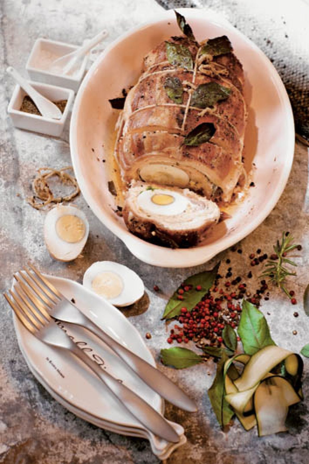 WEŹ: • około kilograma świeżego łososia (filet) • 2 jajka kurze lub kilka przepiórczych • łyżkę pasty z czarnych oliwek • 2 łyżki utartego pecorino • małą cukinię pokrojoną w cienkie długie plastry • sól i pieprz • 10 plastrów szynki parmeńskiej • kilka świeżych listków laurowych • sok z ćwiartki cytryny • oliwę z oliwek • grubo zmielony pieprz
