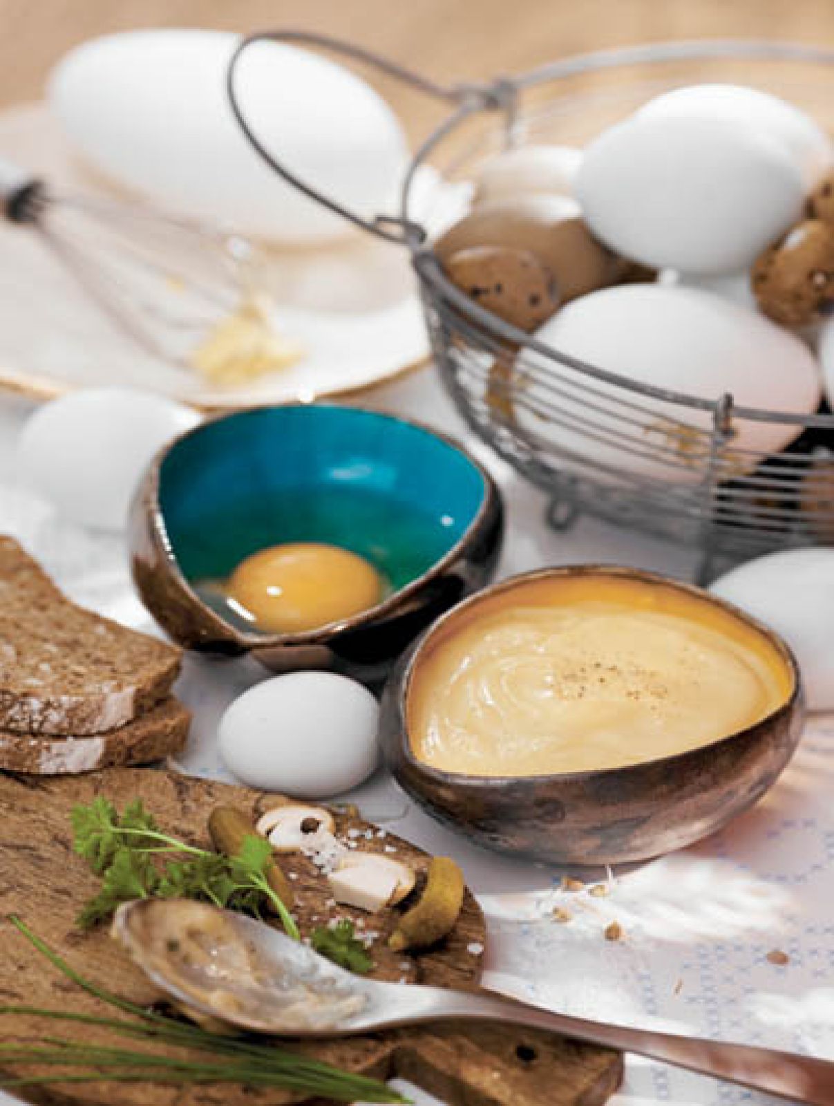 WEŹ: • 5 jajek • kubeczek śmietany kremówki • łyżkę miękkiego masła • 2 łyżki startego ementalera • sól i świeżo zmielony pieprz • garść posiekanych ziół (bazylia, natka pietruszki, kolendra)