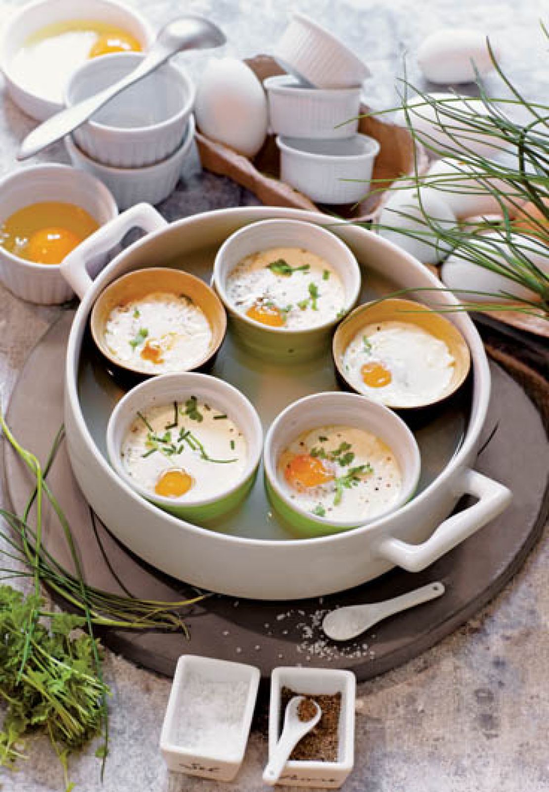 Pięć kamionkowych małych foremek lekko natłuść masłem. Oprósz solą, pieprzem i tartym ementalerem. Śmietankę wymieszaj z posiekanymi ziołami. Do każdej foremki delikatnie wbij po jednym jajku i uzupełnij śmietaną do ¾ wysokości. Żółtko nie powinno zniknąć pod warstwą śmietany. Foremki wstaw do płytkiego naczynia żaroodpornego wypełnionego wrzącą wodą, a całość do piekarnika nagrzanego do 170°C. Po około 10 minutach jajka będą miały ścięte białka i lekko płynne żółtka zatopione w delikatnej śmietanie. Jeszcze odrobina świeżych ziół i cienka kromka ciemnego chleba na zakwasie.