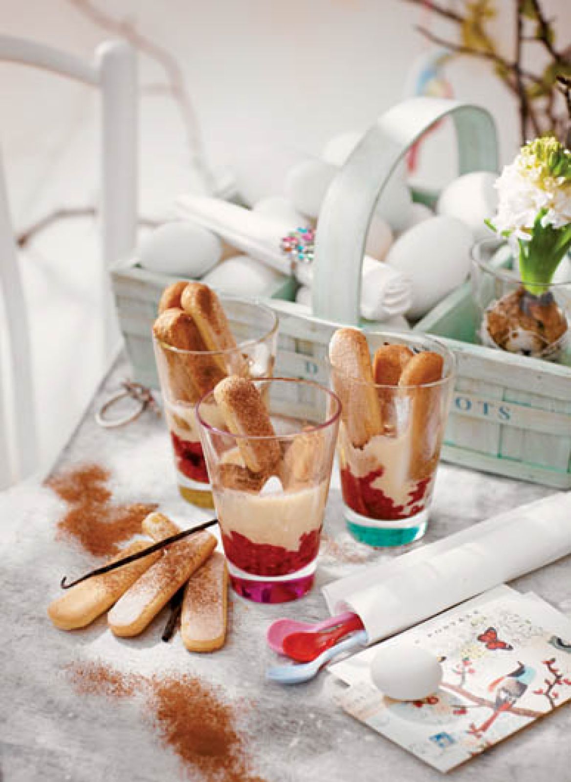 Rozmrożone maliny zmiksuj i przetrzyj przez sito. Dodaj do nich żelatynę. Wymieszaj. Żółtka ubij z 5 łyżkami cukru pudru na puszysty, jasny krem. Dodaj mąkę i wymieszaj, aby nie było grudek. Przełóż do garnuszka. Wlej zimne mleko, mieszaj i powolutku podgrzewaj. Gdy masa zacznie gęstnieć, dodaj masło i ekstrakt z wanilii. Ubijaj, aż powstanie gładki krem. Nie dopuść do zagotowania. Zdejmij z ognia, przestudź. Pucharki lub szklanki napełnij malinowym musem, kremem z żółtek i biszkoptami odrobinę nasączonymi kawą. Wstaw do lodówki na kilka godzin. Tuż przed podaniem oprósz kakao.