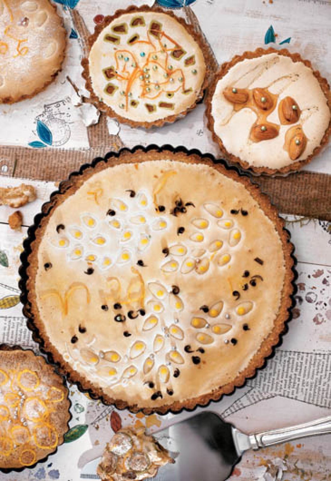 WEŹ: NA SPÓD: • 150 g migdałów bez skórki • ¾ kostki masła • ¼ szklanki cukru pudru • ¼ szklanki cukru brązowego light muscovado • pół szklanki mąki • 4 białka jajek • łyżeczkę likieru amaretto • łyżeczkę proszku do pieczenia; NA WIERZCH: • 5 żółtek • pół szklanki cukru do wypieków • ekstrakt waniliowy • płaską łyżkę mąki ziemniaczanej • 3 łyżki rodzynek namoczonych w maladze; DO DEKORACJI: • migdały, orzechy, kolorowe lukry, czekoladowe i kokosowe wiórki, pomarańczową skórkę