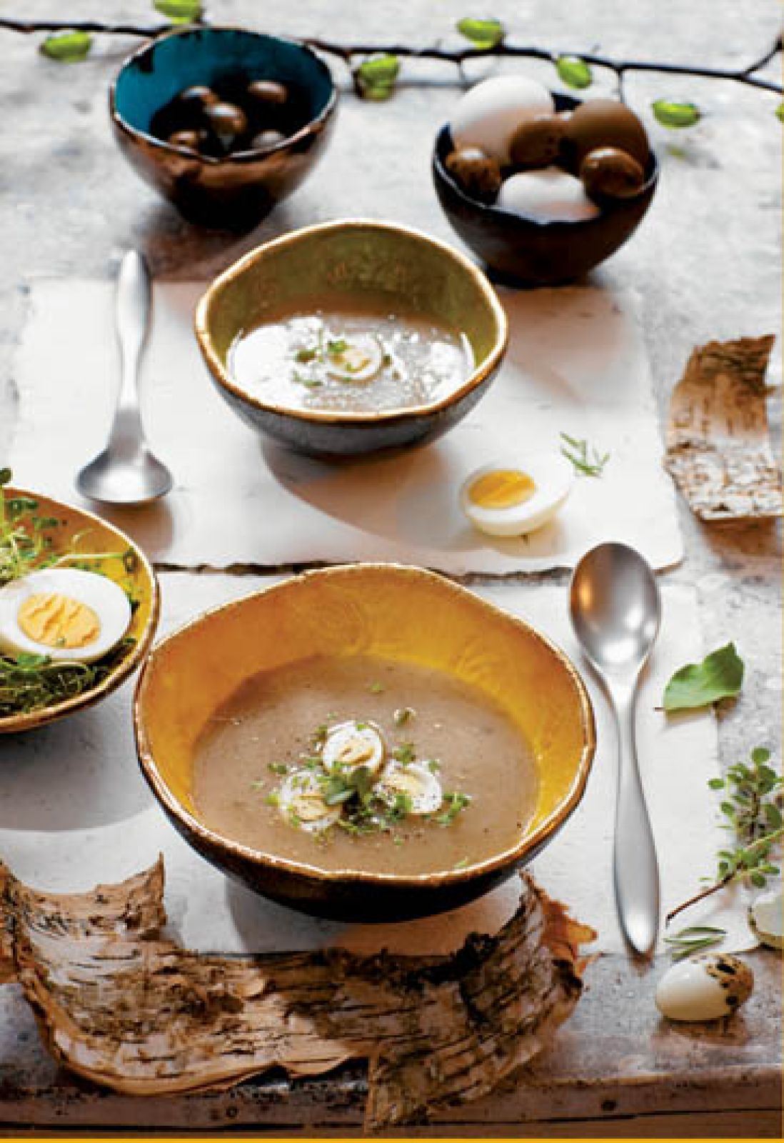 WEŹ: NA ZAKWAS: • ¾ szklanki razowej mąki żytniej • 400 ml letniej wody • 2 ząbki czosnku • 2-3 listki laurowe • kilka ziaren ziela angielskiego • kawałek skórki razowego chleba oraz • włoszczyznę • listek laurowy • ziarenka czarnego pieprzu i ziela angielskiego • pokruszony suszony majeranek • kawałek wędzonego boczku (niekoniecznie) • kilka suszonych grzybków • około 2 litrów wody • kilka jajek przepiórczych (po kilka do jednej porcji żurku)