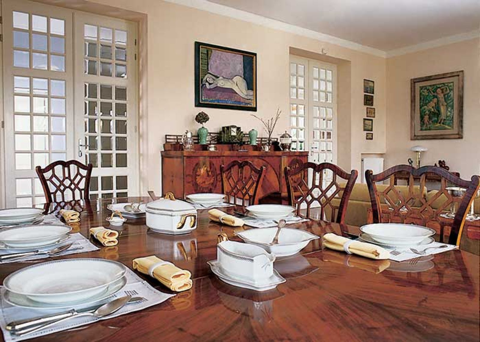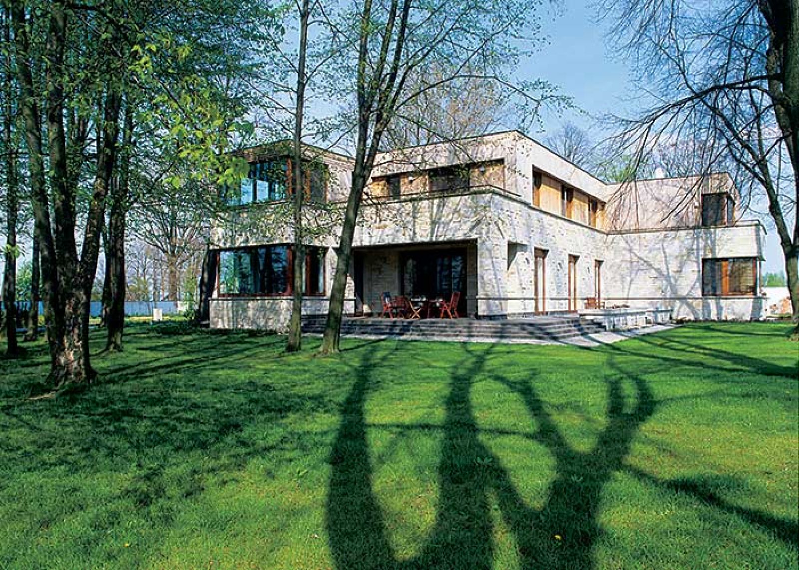 Basia i Tomek dla swojej artdekowskiej kolekcji potrzebowali wysokich wnętrz i dużych otwartych przestrzeni, no i wiedzieli, że tylko nowoczesna architektura dobrze pasuje do tego stylu. Bryłę budynku zaprojektowali Wojciech Szymborski i jego syn Leszek – bardzo odważną, zwłaszcza jak na wieś. Wnętrze, podobnie jak warszawskie mieszkanie Basi i Tomka, urządzili Magda i Bazyli Krasulak.