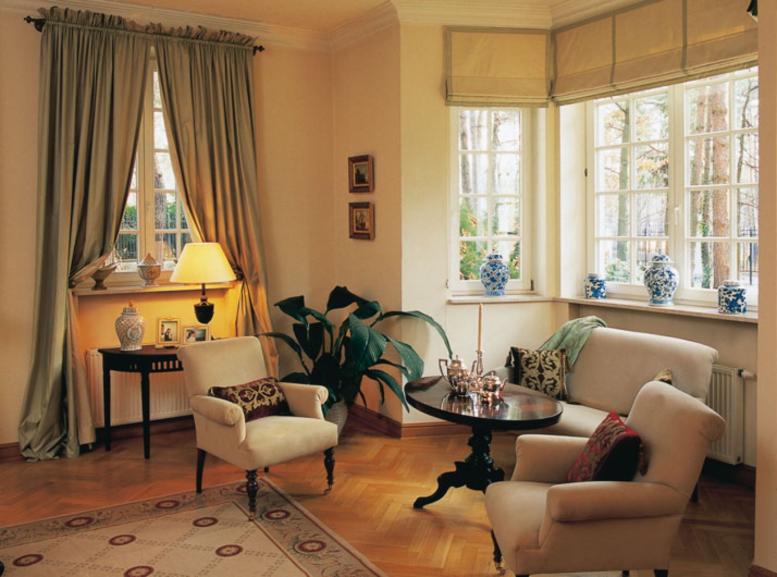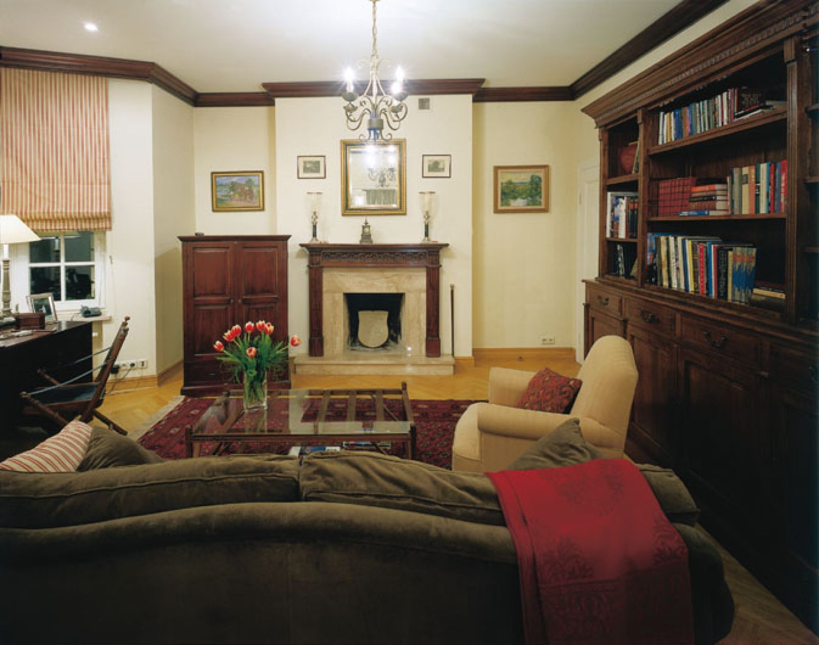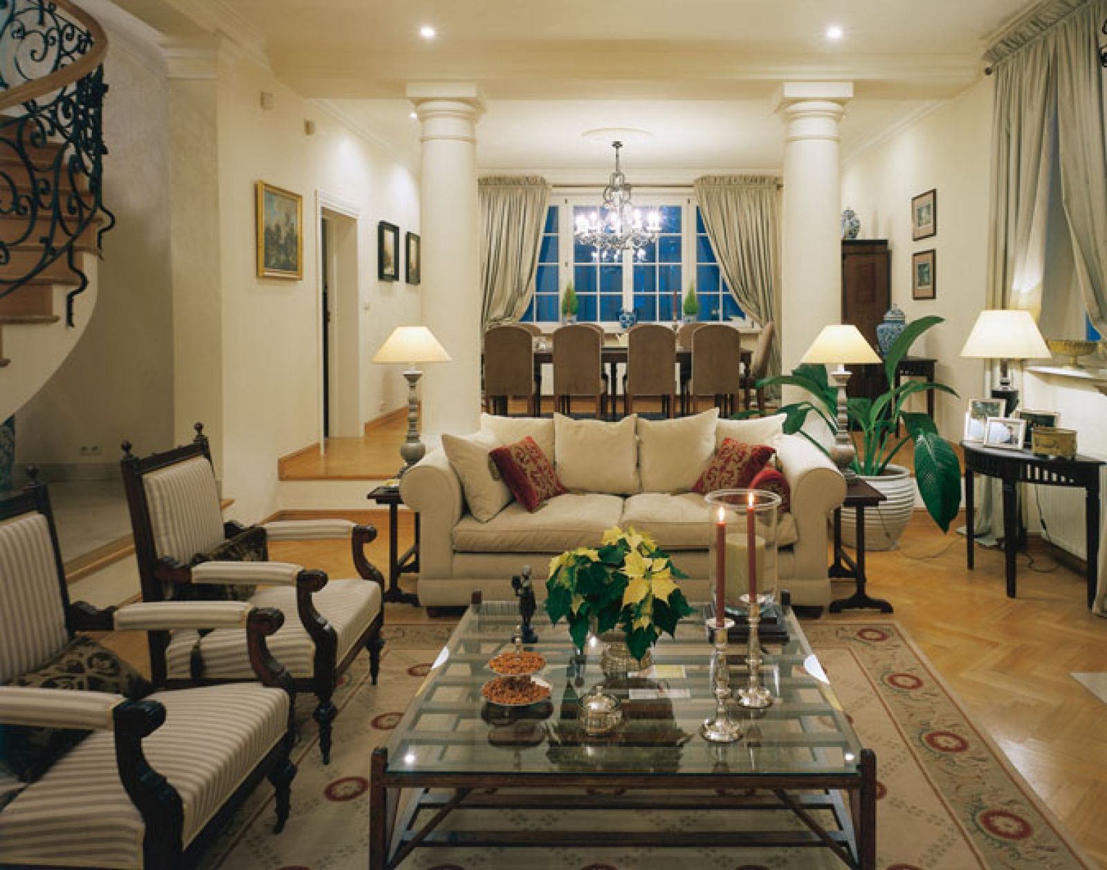 Urządzenie wnętrza sprawiało sporo kłopotów, które skończyły się w momencie, kiedy pani Katarzyna odkryła sklep „Plac Vendome”. Efektem niezawodnego smaku i zbliżonych gustów właścicielki, pani Jolanty Barazzoli i jej nowych klientów jest wystrój konstancińskiej willi. Utrzymany w tradycyjnym stylu, wypełniony atmosferą przytulności i ciepła. Gospodarze nie upierali się przy oryginalnych meblach z epoki, dlatego większość z nich to kopie. Nie lękają się także zarzutu eklektyzmu. Ważne, aby wnętrze sprawiało wrażenie określonego ładu i harmonii.