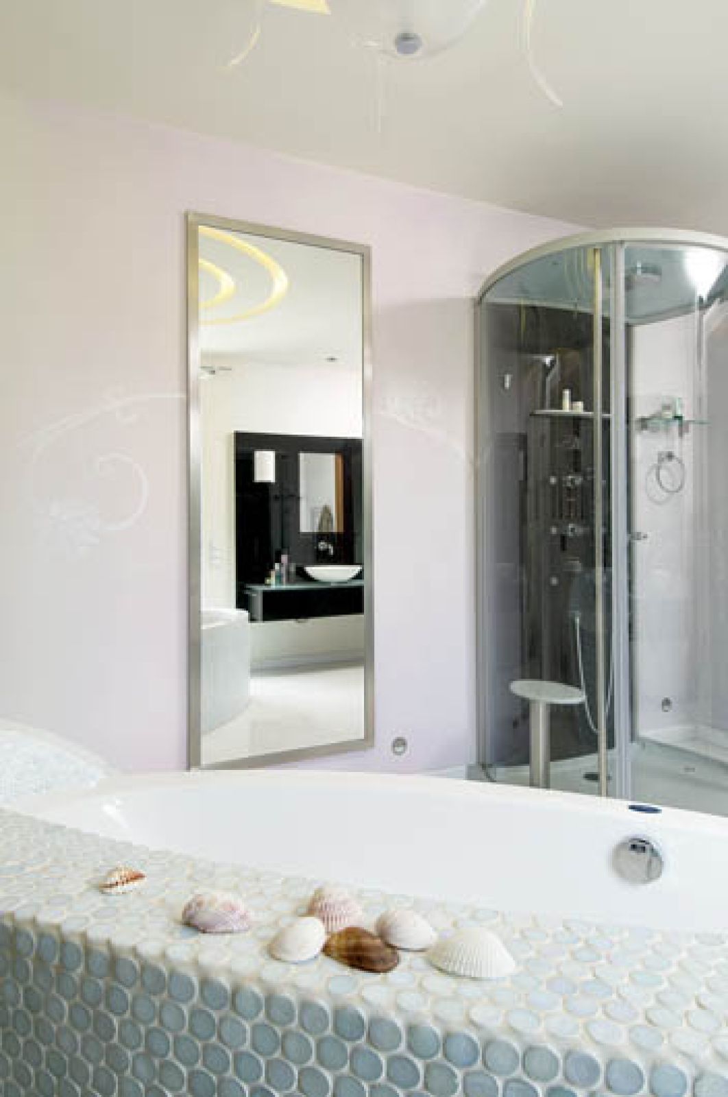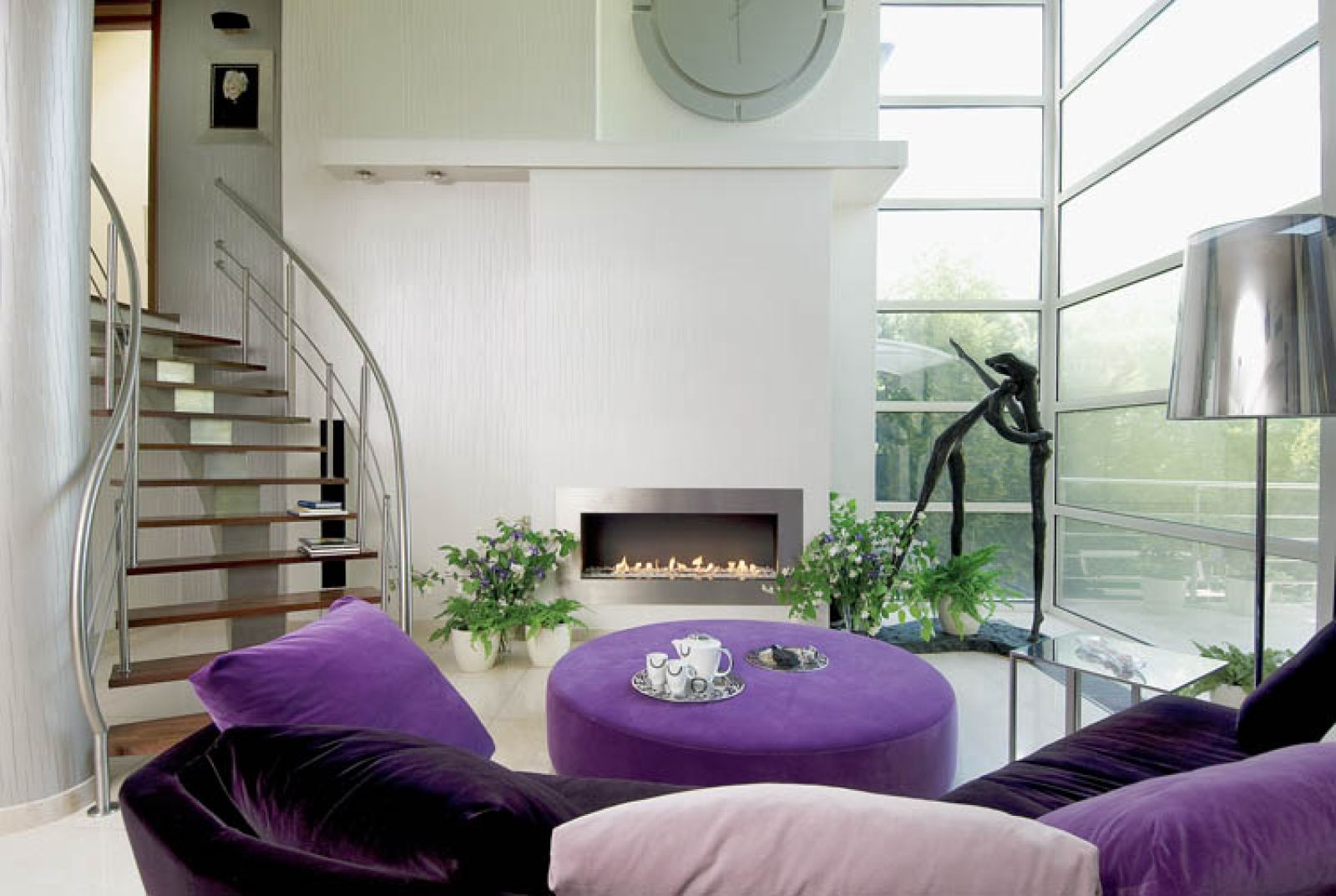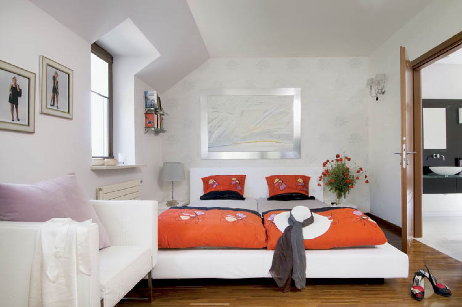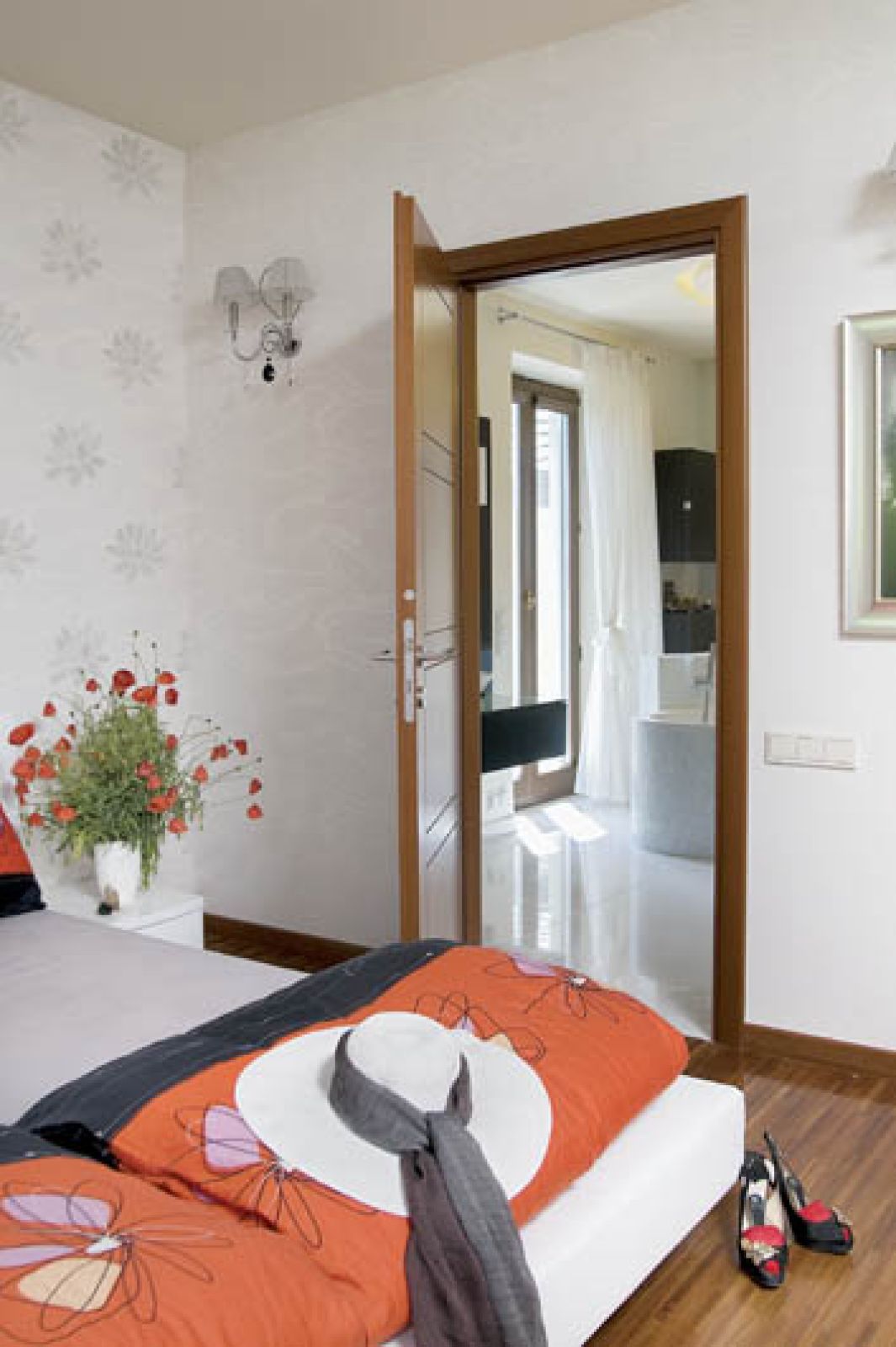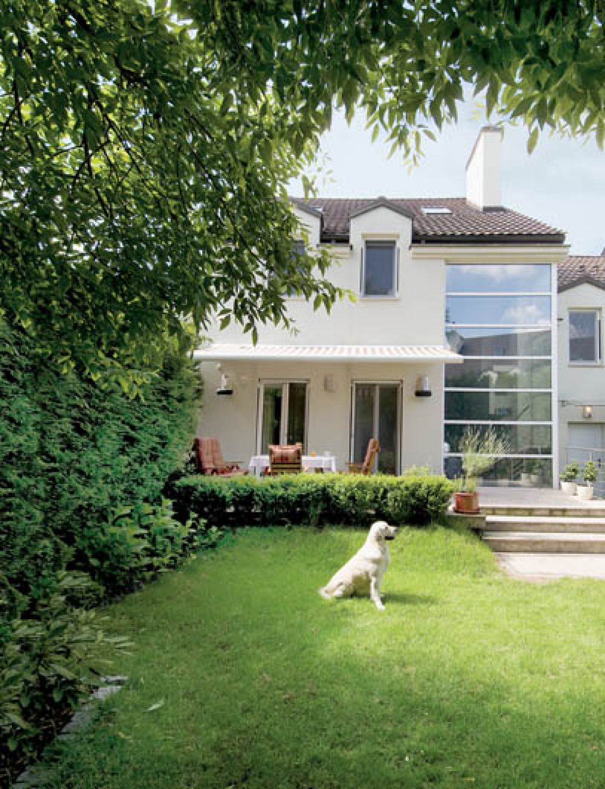 Kolor natomiast zapewniają ściany, wcale nie takie zwyczajne: Ania Pabisiak, studentka ASP, wymalowała je w pastele delikatnie przechodzące jedne w drugie. Tuż obok jest niezwykła sypialnia. Niby zamknięta, ale w mgnieniu oka zamienia się w otwartą. To dzięki ścianie ze szkła priva lite, które może być matowe albo (za dotknięciem przycisku na pilocie) przezroczyste. A wtedy widać stąd wielki zegar firmy Alivar nad kominkiem i ogród, który zieleni się za wysokim na dwa piętra oknem w salonie.